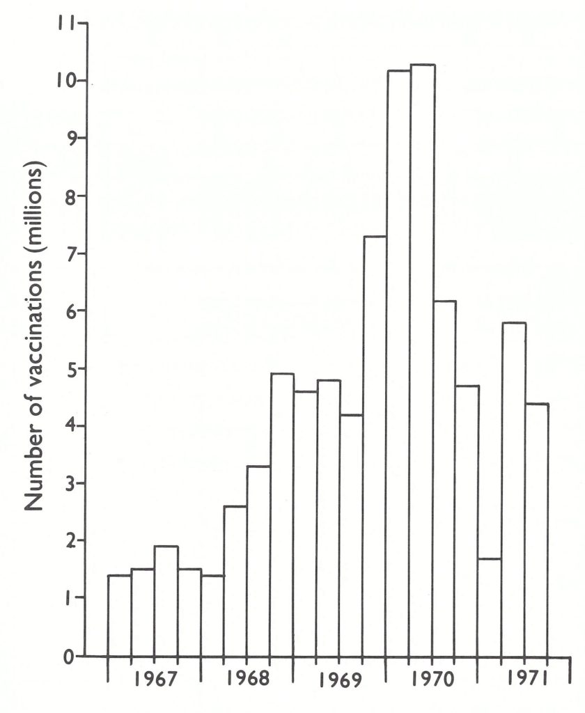 The programme was launched in November 1966, and by the end of the year 452 000 persons had been vaccinated. Although it was a hopeful beginning, the subsequent development of the programme was hampered by erratic federal commitment, frequent changes in leadership and serious problems with the quantity and the quality of vaccine produced. The outcome, only a few months before the last case occurred, was anything but certain.