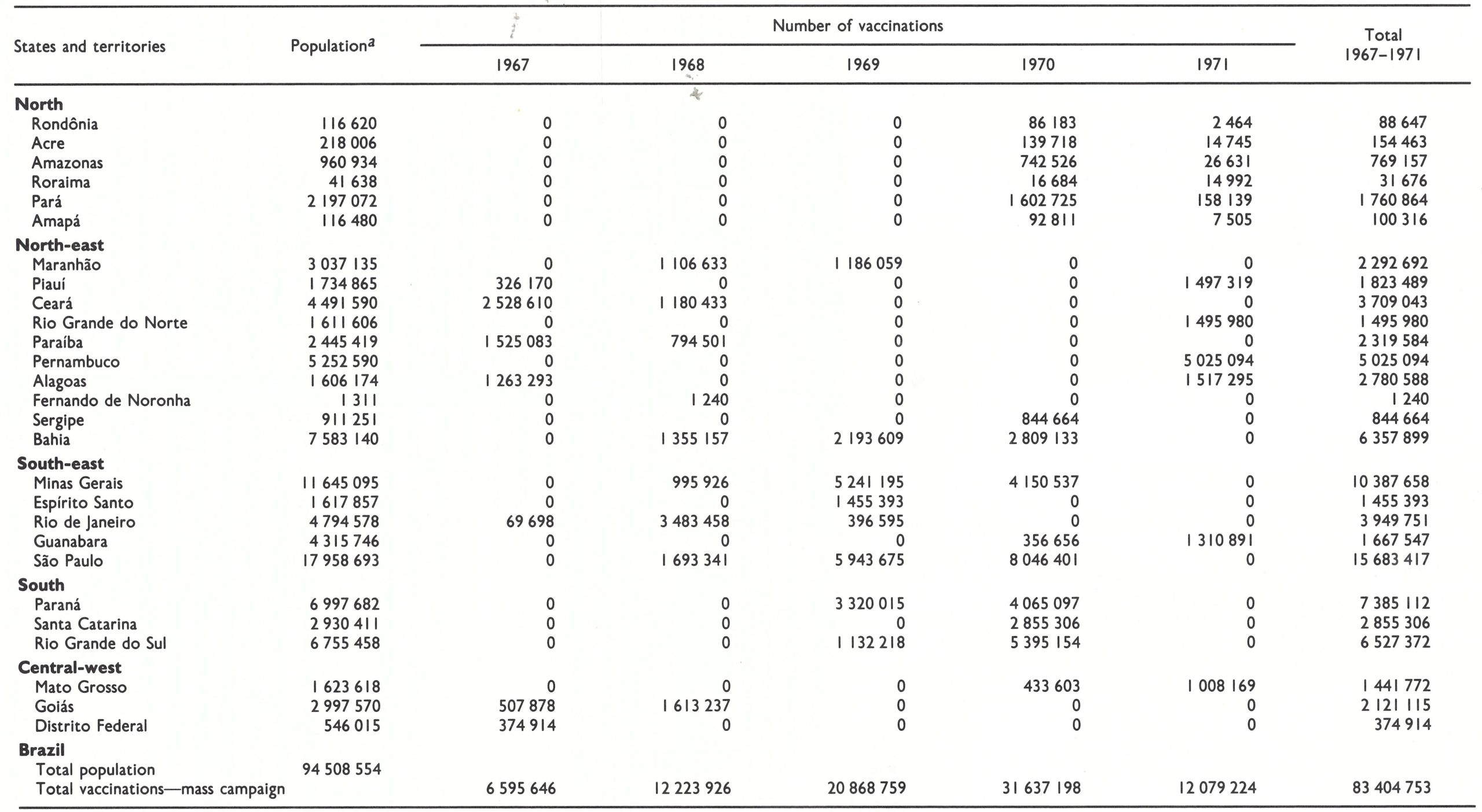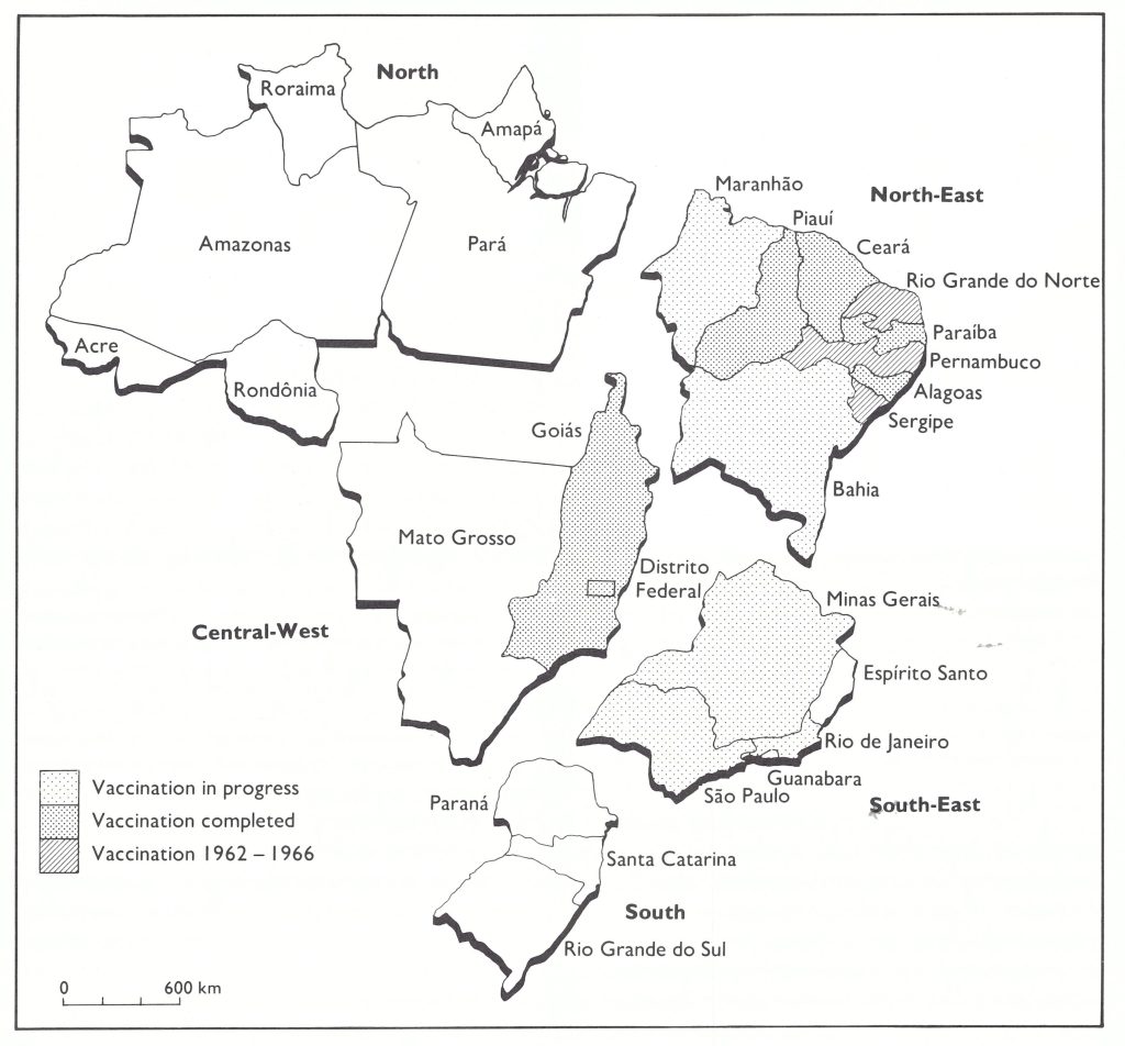 In 1962, Brazil launched a national campaign against smallpox (Rodrigues, 1975). By the end of 1965, 24 million vaccinations had been performed in a population of 84 million. The initiative for the campaign rested with the authorities of the separate states and territories, few of which were strongly motivated. Not many of the staff were employed at the federal level and only one of them travelled to the field to assist states in developing and monitoring programmes. The campaign was considered to have been satisfactorily executed in no more than 4 of the 27 states and territories. The number of reported smallpox cases throughout the country decreased from 9763 in 1962 to 3623 in 1966. However, because the reporting system had shown little improvement over this period, the decreasing incidence figures meant little.