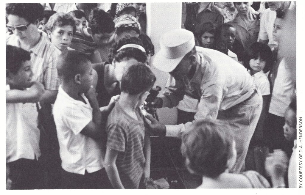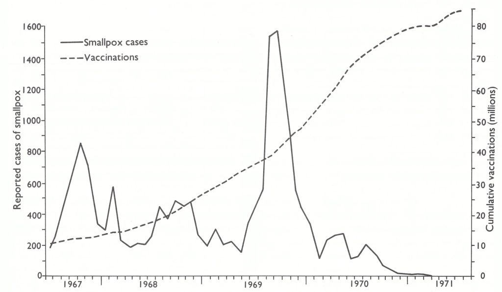 “. . .it is possible to eradicate smallpox in the Americas by immunizing the population at risk, within a relatively short time . . . although good coordination of all health services can be achieved for the smallpox eradication program or national smallpox vaccination programs, the same cannot be said of maintenance programs . This underlines the need to carry out smallpox vaccination programs simultaneously in as short a time as possible . If this is done and smallpox disappears, and good epidemiological surveillance services are established, then the intervals between revaccination may be gradually increased . . .” (Pan American Health Organization, 1967).
