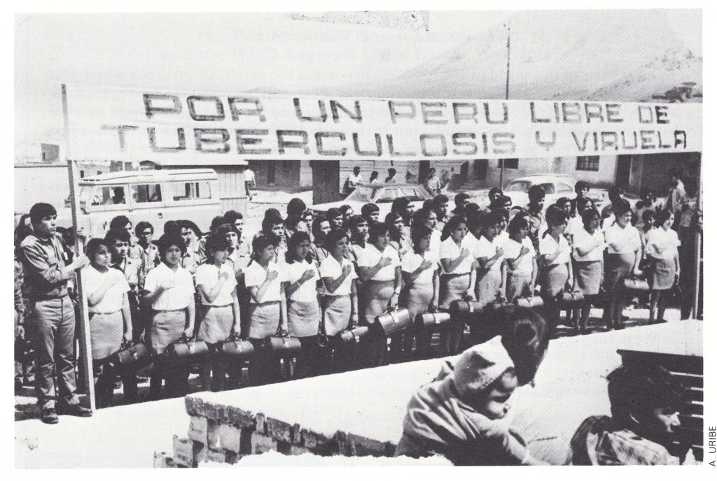 Plate  12.1.  Peruvian vaccinators pose under a banner at the conclusion of a training programme in 1968. Both smallpox and BCG (tuberculosis) vaccines were given; hence the banner reading “For a Peru Free of Tuberculosis and Smallpox”.