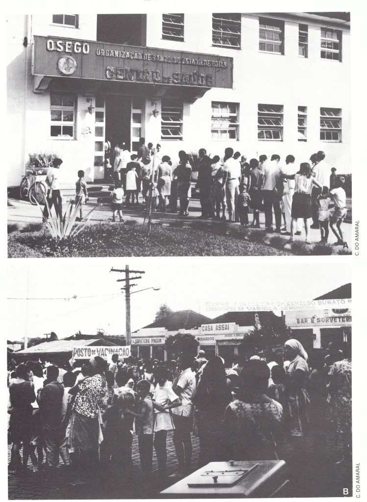 Plate 12.9. Well-organized, intensive publicity campaigns drew large numbers of people to vaccination sites. A: Health centre in Cambe, Parana State, in 1970. B: Vaccination post (posto de vacinacao) in a commercial centre in Goias State in 1969.