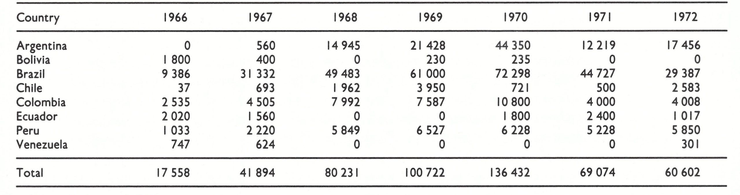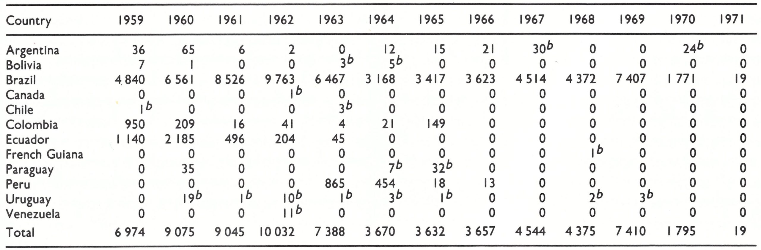 Outside Brazil, only 60 cases of smallpox were reported in the Americas after 1966. All were in areas adjacent to Brazil. Except for 30 cases in northern Argentina in 1967, when sources of infection were not identified, all could be traced to importations. Because surveillance was poor throughout the areas neighbouring Brazil, other importations probably occurred but did not result in sustained transmission.