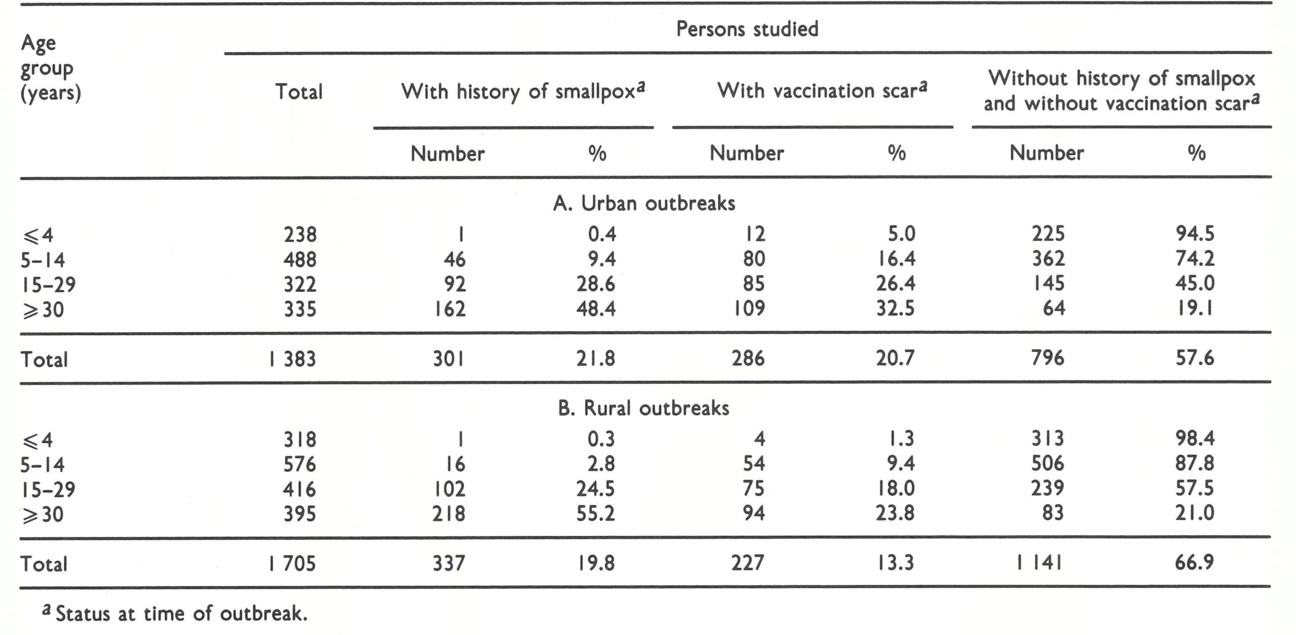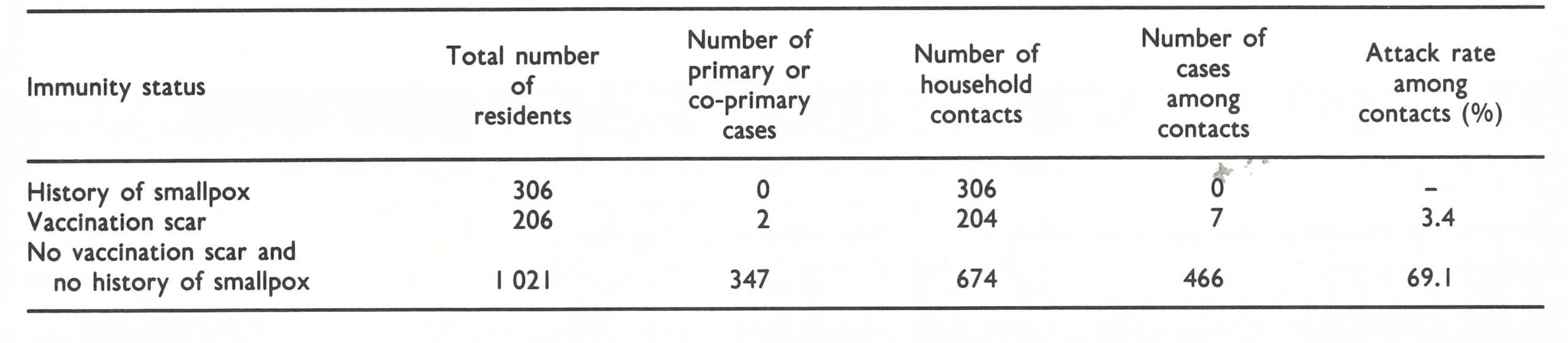 A survey of residents of the 104 infected households revealed that about 25% had a history of smallpox ; another 18% had a vaccination scar. Of the susceptible individuals, 69 % contracted smallpox. No cases occurred among those who had already had smallpox; 4 cases occurred among those with vaccination scars, the years of vaccination being 1938, 1947,1965 and 1967 respectively. The last 2 were very mild cases with few lesions. The ageadjusted vaccine-efficacy ratio was calculated to be 94%.