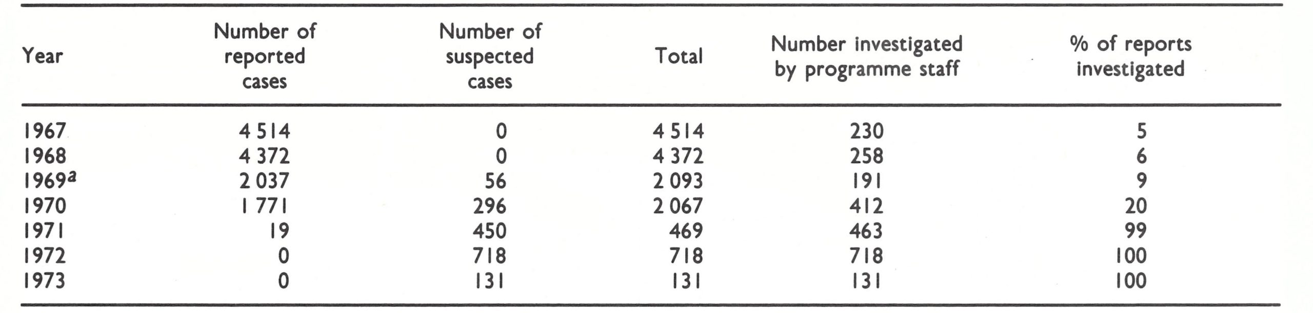 Although the rudimentary surveillance system had been temporarily strengthened by the addition of the 4 epidemiological units in 1969, few suspected cases were investigated or outbreaks contained until late in 1970. The inadequacy of the system until 1971 is apparent from the data presented in Table 12.13.