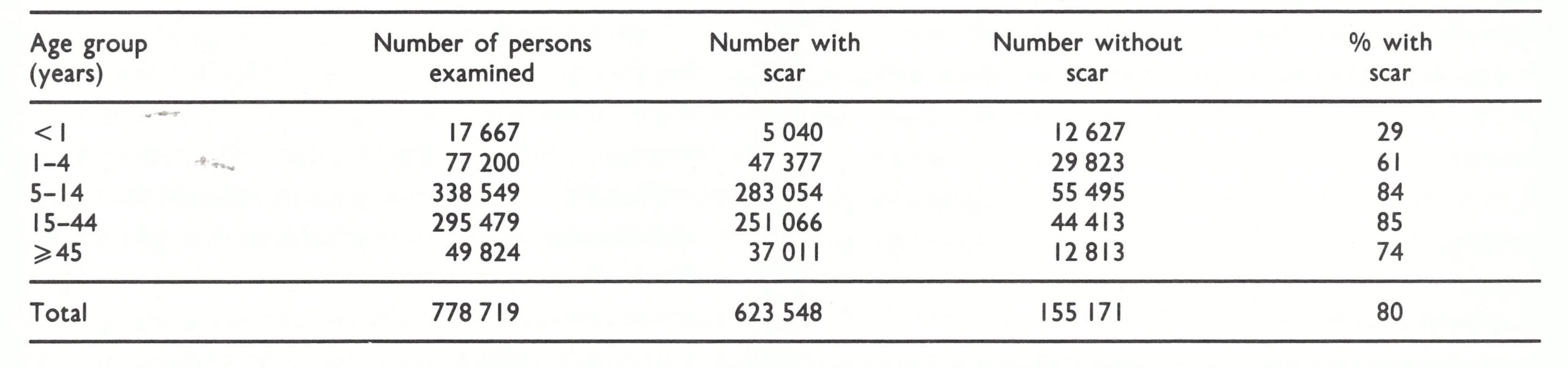 The total of 80% with vaccination scars was impressive considering that programmes in some states had concluded as long as 4 years earlier. When the results were examined by state, at least 70% of the population were found to have vaccination scars in all states except Bahia and Ceara, in which the proportions were 59% and 56% respectively.