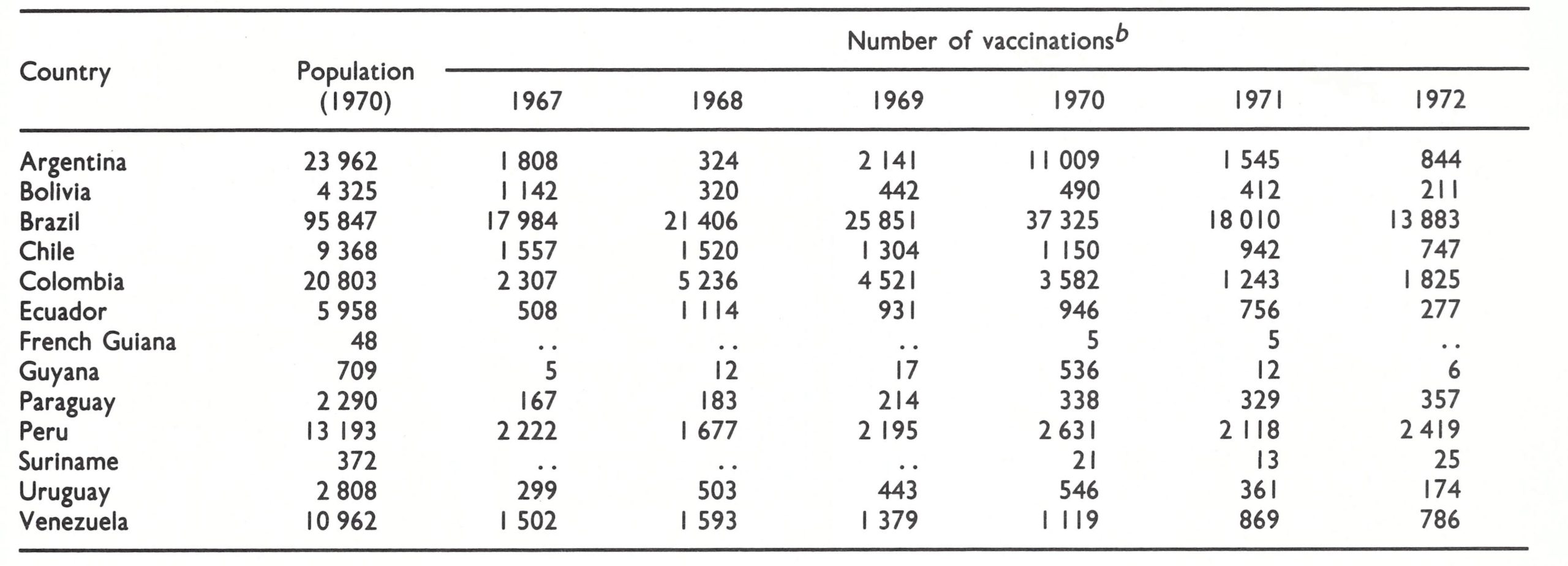 Table 12.3: South America: population and number of reported smallpox vaccinations, 1967-1972 (thousands)a