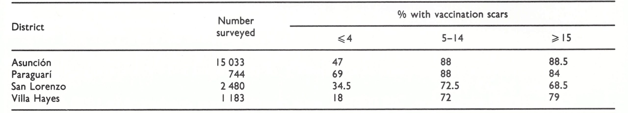 Paraguay, on the other hand, sharing a border with Brazil and receiving many travellers from that country, was at unusually high risk. Because of fiscal constraints, however, it was unable to carry out a special programme. A mass vaccination campaign had been conducted between 1958 and 1960, during which 86% of the population was said to have been vaccinated. After that time, routine vaccination was offered in health centres. During May and June 1971, a WHO—Paraguay team conducted a search for cases and also performed scar surveys in several areas to assess the level of immunity (Wkly epidem. rec., 1971a ; Table 12.4). No cases of smallpox were found, and 78.5%, of those surveyed bore vaccination scars. It was apparent that the existing health services had done reasonably well in sustaining immunity. A costly special campaign might have improved the levels of immunity, at least among young children, but, as was apparent in retrospect, it was not needed.