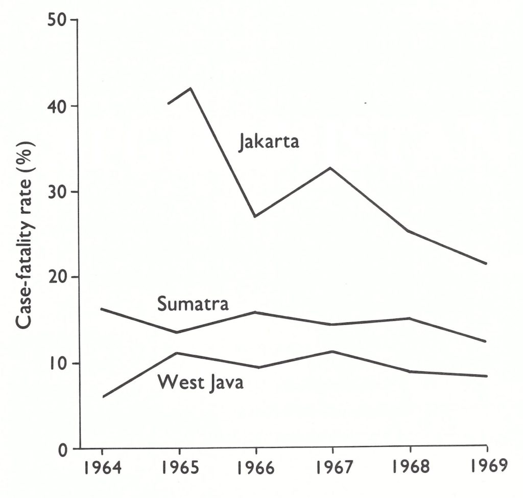 Fig. 13.11. Jakarta, Sumatra, and West Java: smallpox case-fatality rates, 1964-1969.