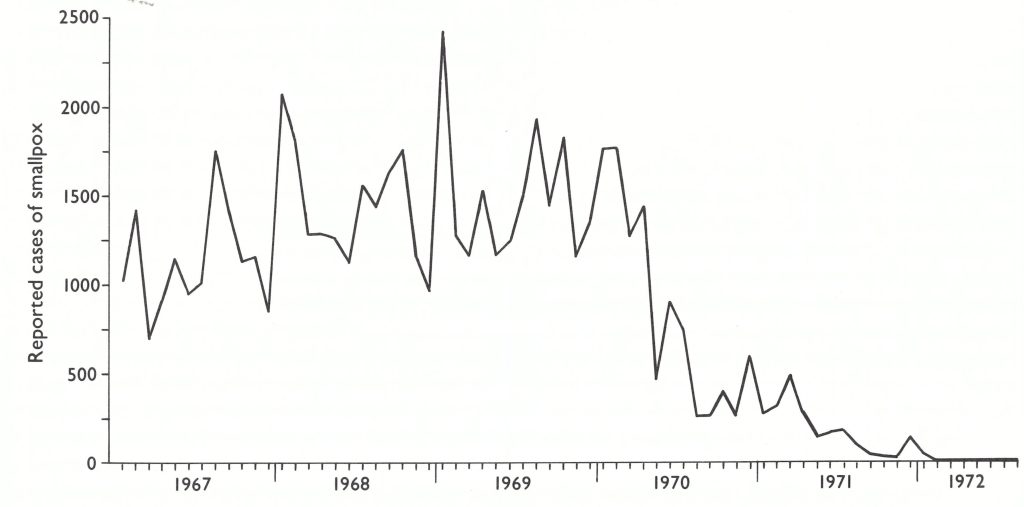 Containment activities were ever more rigorously defined and performed. In each outbreak, the “fire-fighting” or advance teams ensured that patients were isolated in their houses; the names of all villagers were recorded and everybody was vaccinated; the source of infection was identified and investigated; and the teams remained in the village at least overnight to ensure more complete vaccination of those working in the fields or absent during the day at the market or in school.