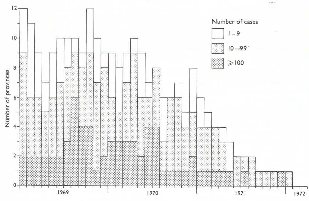 Reporting was incomplete. In all, 1265 cases and 413 deaths had been recorded during 1967, but because so many cases were found during the survey the actual number of cases was thought to be at least twice this figure.