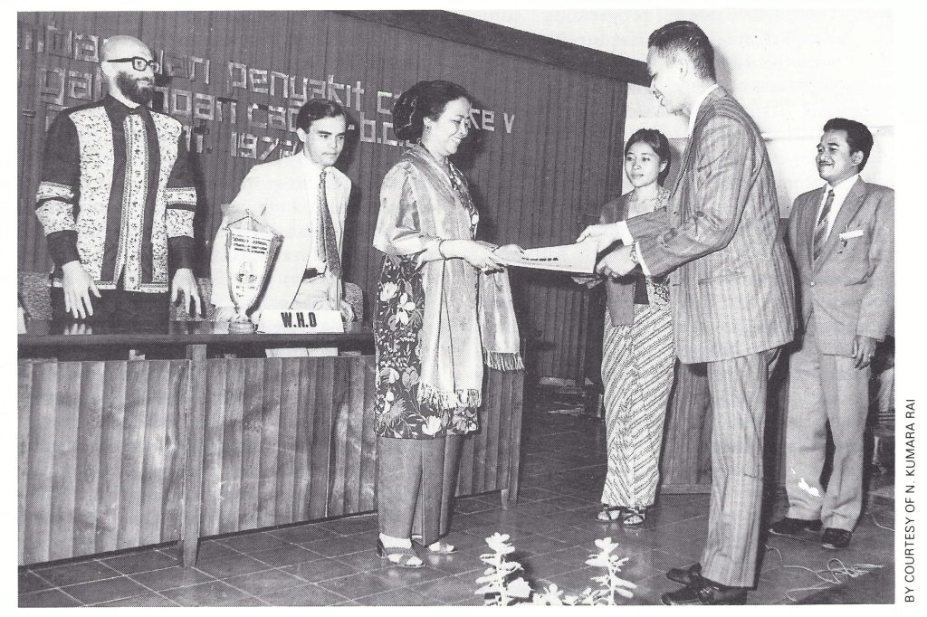 Plate 13.1. Several national and intercountry seminars on smallpox eradication were held in Indonesia . At the concluding seminar, in September 1972, Julie Sulianti Saroso, Director-General for the Control and Prevention of Communicable Diseases, presented an award to Nyoman Kumara Rai, who had directed the Indonesian Programme since April . Standing behind the Director-General are 2 WHO advisers, G .G .O . Cuboni (for left) and W . L . R . Emmet.