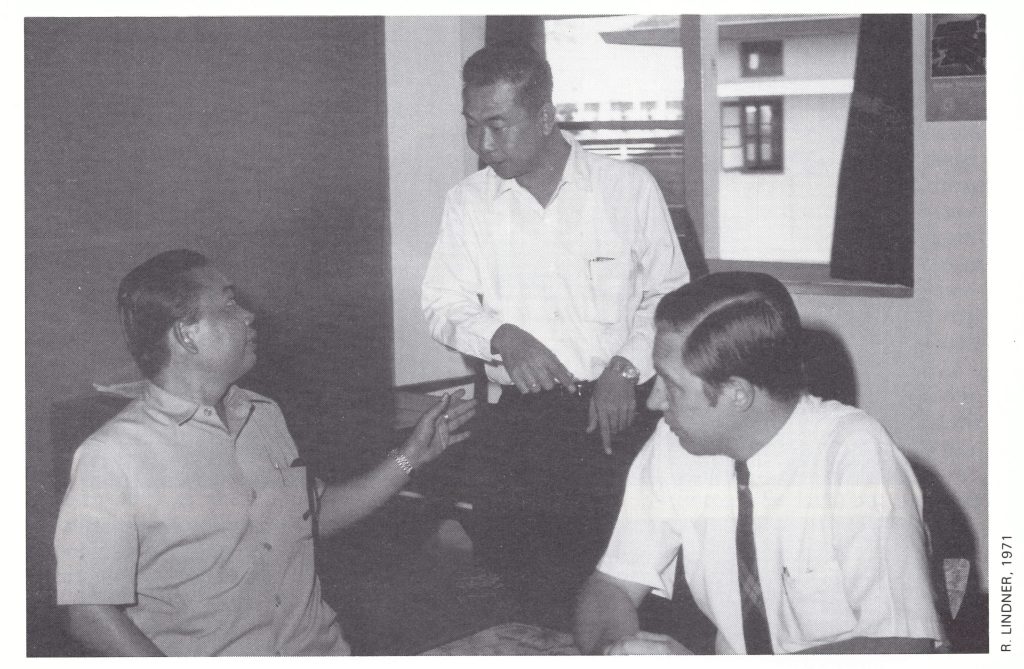 Plate 13.3. Petrus Aswin Koswara (1931 – 1974), directed the national programme until April 1972. Standing at centre, he is speaking with Dr Hasan Anoez, Provincial Medical Officer in South Sulawesi, and D . A . Henderson in 1971.