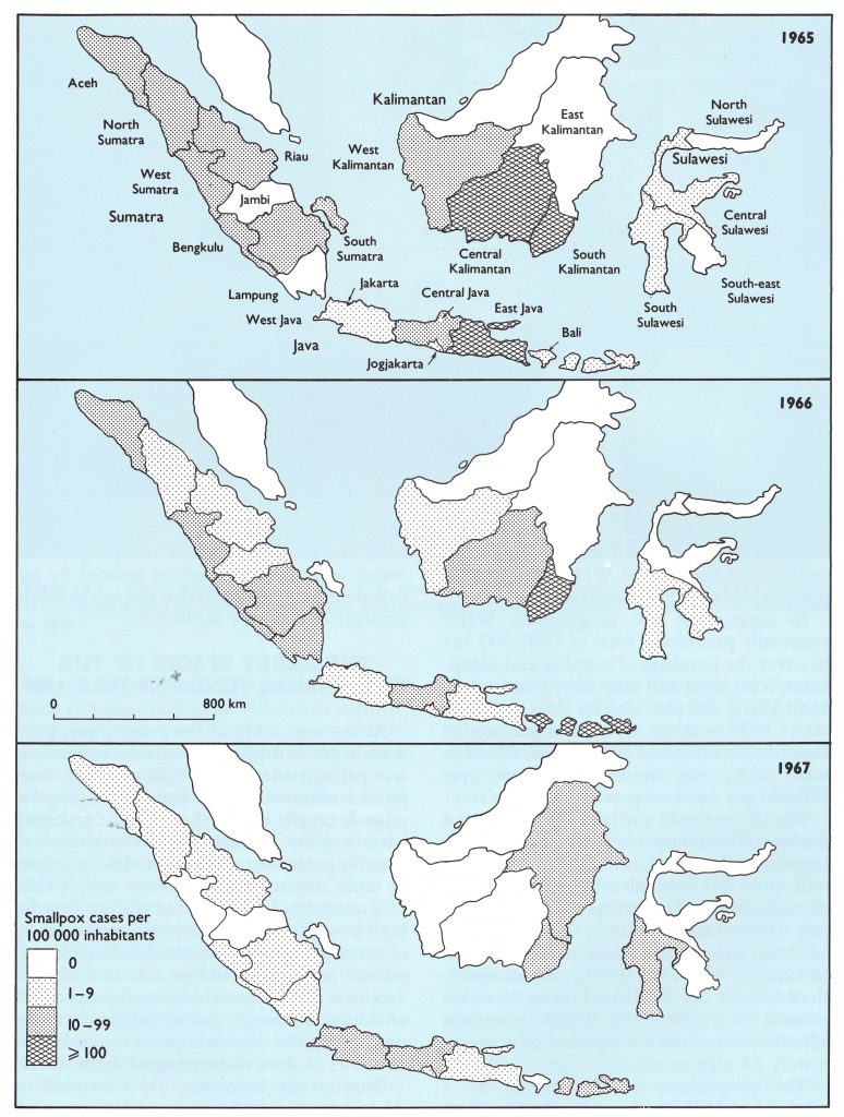 Similiar occurrences of slowly spreading epidemic smallpox in well-vaccinated populations were observed throughout the rural areas of West Java and, to some extent, of Central Java. In the other endemic areas of Indonesia, non of those which experienced smallpox after 1968 was so densely populated and smallpox there was far more easily contained.
