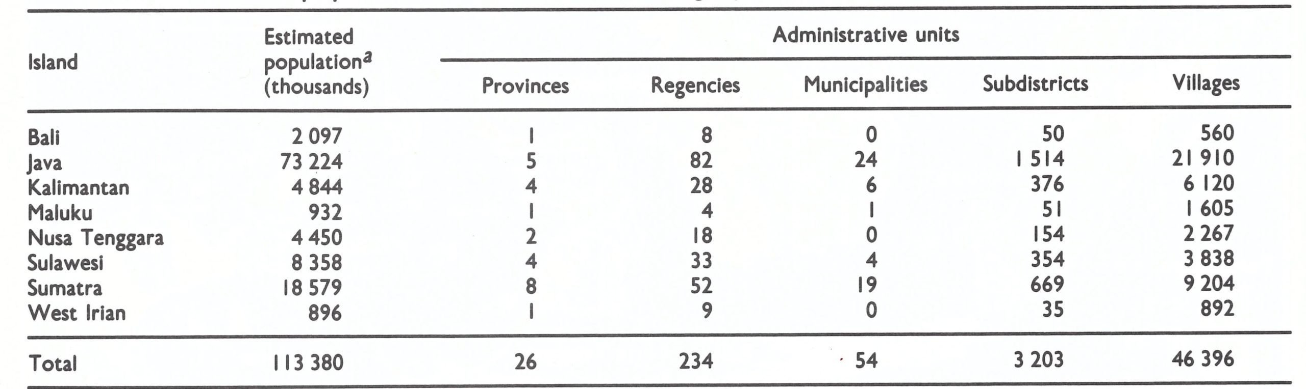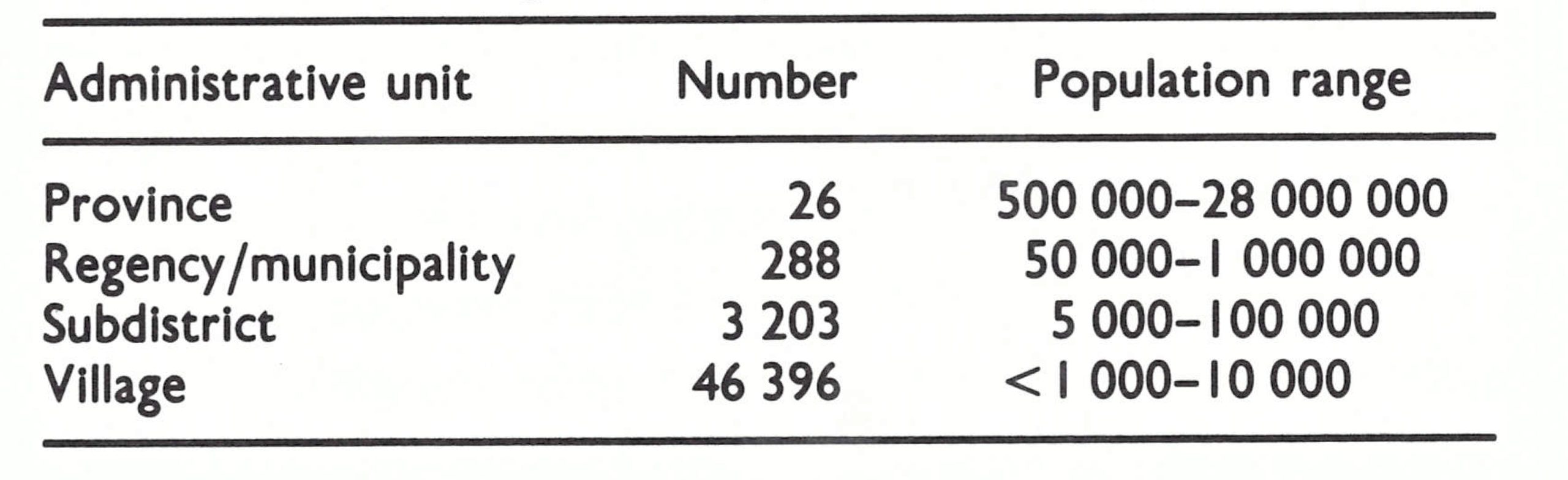 For administrative purposes, Indonesia in 1968 was divided into 26 provinces, which were subdivided into 288 regencies and municipalities (Table 13.2), consisting of 3203 subdistricts . The smallest administrative unit was the village. The size of the population in these administrative divisions varied considerably from one area to another.