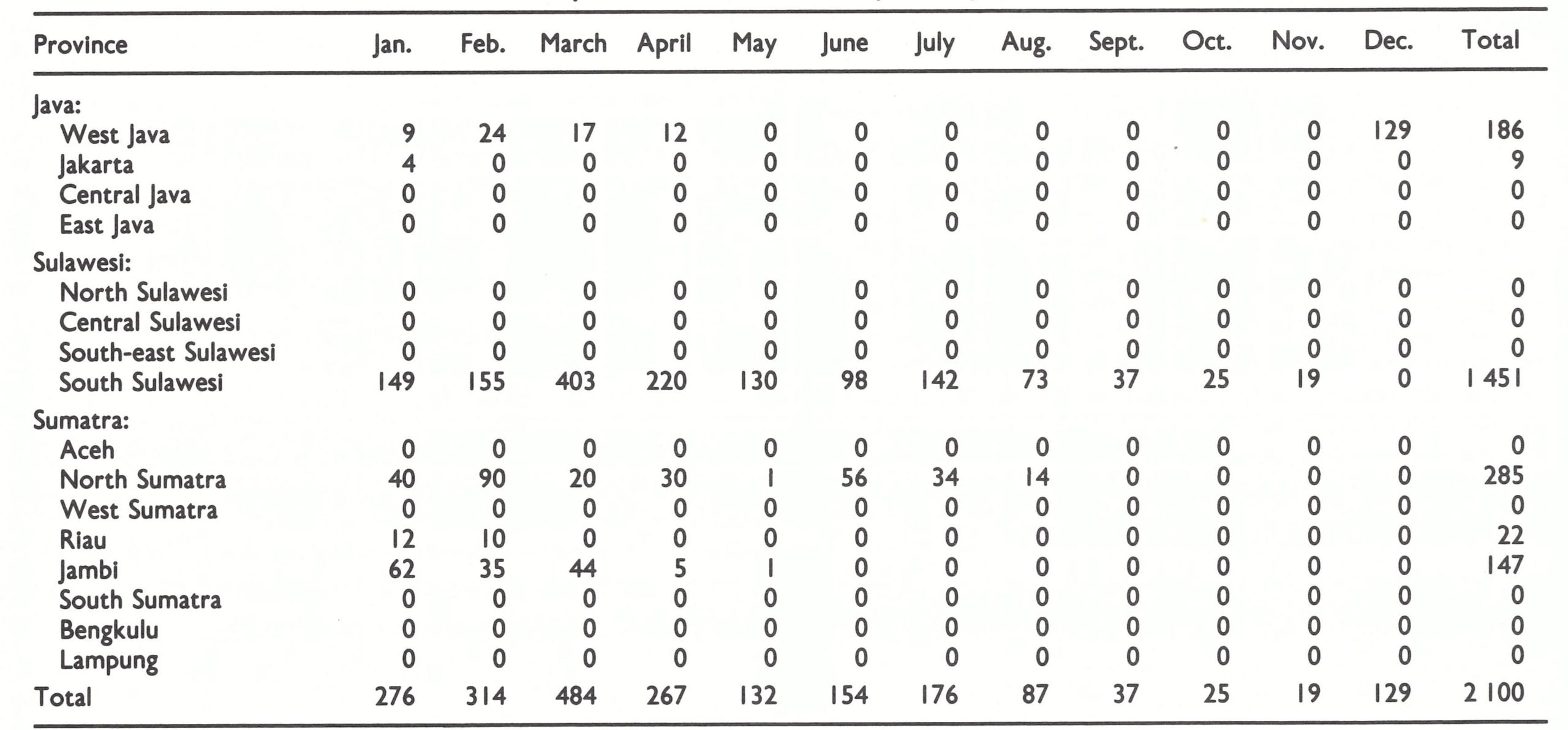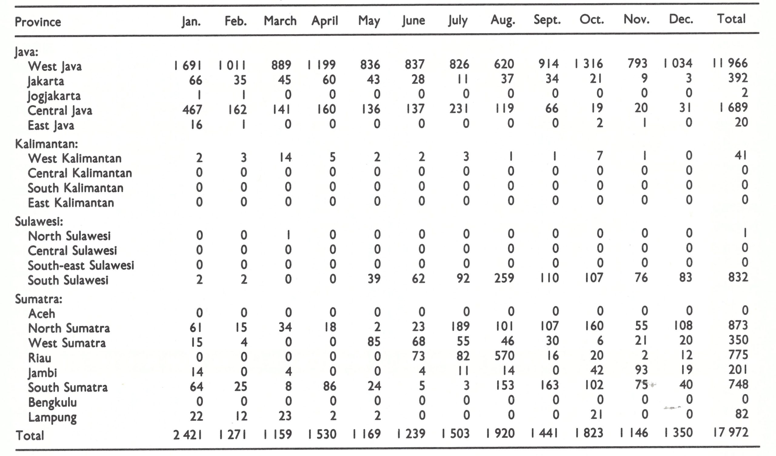 Until 1970, resources and energies were principally directed to the containment of smallpox in the heavily populated island of Java. With the number of cases declining rapidly in Java during 1970 (from 1160 in January to 210 in June and to 49 in December) additional resources could be diverted to the two outer islands still harbouring smallpox—Sumatra and Sulawesi.