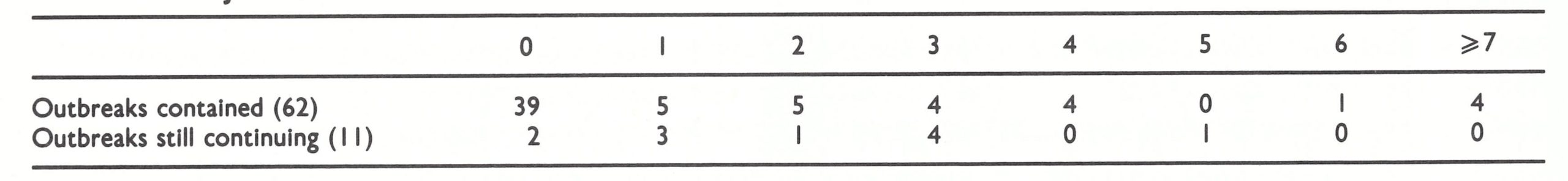 In Jakarta, under the leadership of Dr Guno Wiseso, special teams equipped with jet injectors demonstrated the efficacy of the outbreak-containment strategy. During a 3-month period, they investigated and contained 73 outbreaks, in which 217 cases had been reported (Wkly epidem. rec., 1970a). The teams searched for additional cases, endeavoured to find the origins of the outbreaks and vaccinated the inhabitants of the affected administrative units (about 200 persons in each unit), as well as the people living in the 4 surrounding units. During these activities they discovered an additional 215 cases and vaccinated some 73 000 persons. A subsequent assessment revealed that smallpox transmission had ceased within 2 weeks of containment in two-thirds of the outbreaks (Table 13.12). Although these results would be considered poor by later standards, it was clear that outbreaks could, in fact, be quickly stopped.