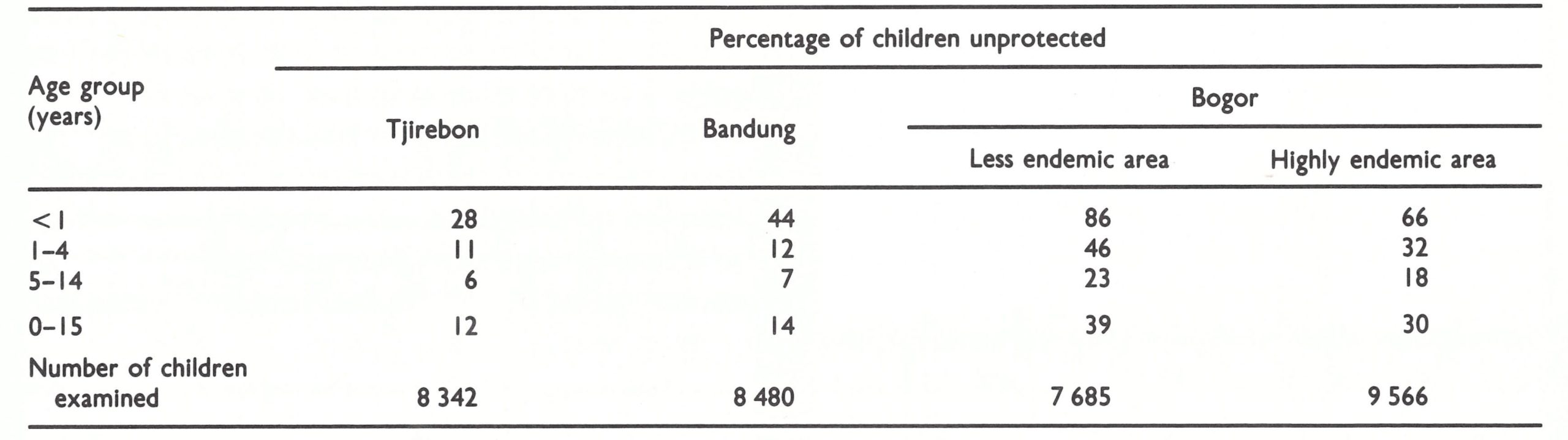 In October 1970, after transmission had been interrupted in the 3 regencies, surveys were conducted to determine comparative levels of vaccinial immunity (Table 13.14). Smallpox transmission had been rapidly interrupted in Tjirebon once surveillancecontainment measures had been effectively applied, but vaccinial immunity was already high there. Success had also been achieved in Bandung with improved supervision but at a considerable cost in resources. Bogor presented a contrast. There, transmission had also been successfully interrupted with surveillance-containment only, although 2-3 times as many unprotected children remained. The proportion that was unprotected was almost as high in the infected areas—in which containment vaccination had been extensive—as it was in the less endemic areas.