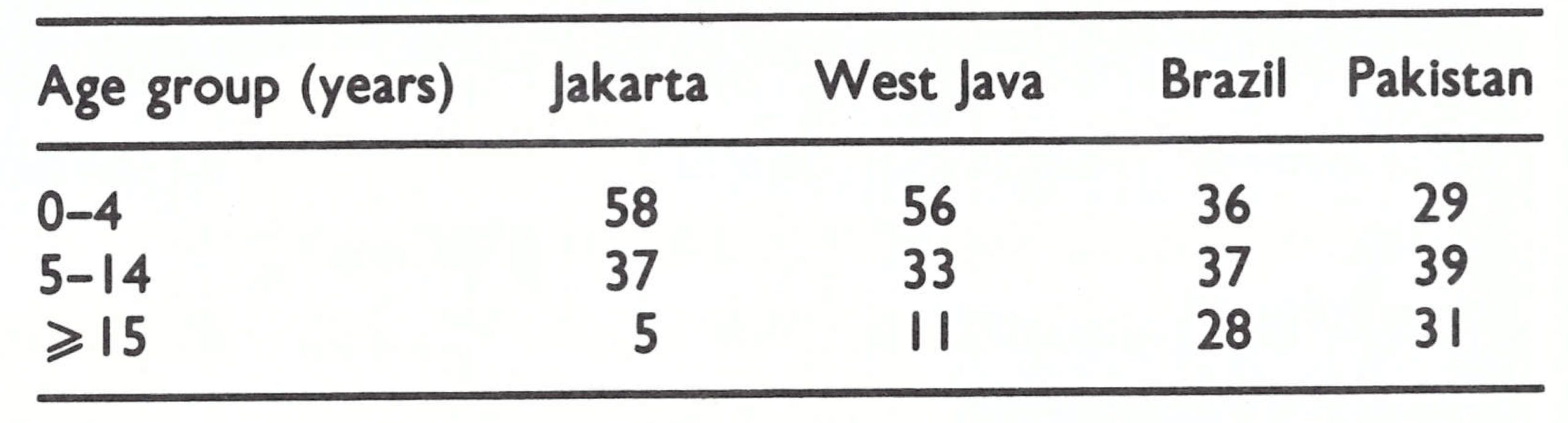 Everyone involved in the programme was surprised by the tenacity of smallpox in these and other regencies of Java despite comparatively high levels of vaccinial immunity and intensive surveillance-containment measures. It was a contrast to the situation in Brazil and western Africa, in which surveillance and containment had quickly stopped transmission, even in less well vaccinated populations (see Chapters 12 and 17). Indonesia, demographically and socially, was different in several respects (Wkly epidem. rec.,1970a). Population density in Java was one of the highest in the world and, traditionally, families carried children who were sick from house to house to visit relatives. The tradition of isolating cases, so often observed in other countries, was uncommon. Thus, many more susceptible persons, on average, were exposed to smallpox cases than in most other areas. Because of high levels of vaccinial immunity and the greater frequency of exposure of susceptible persons, the age distribution of cases was different in Java from the corresponding distributions in Brazil and Pakistan, for example (Table 13.15).