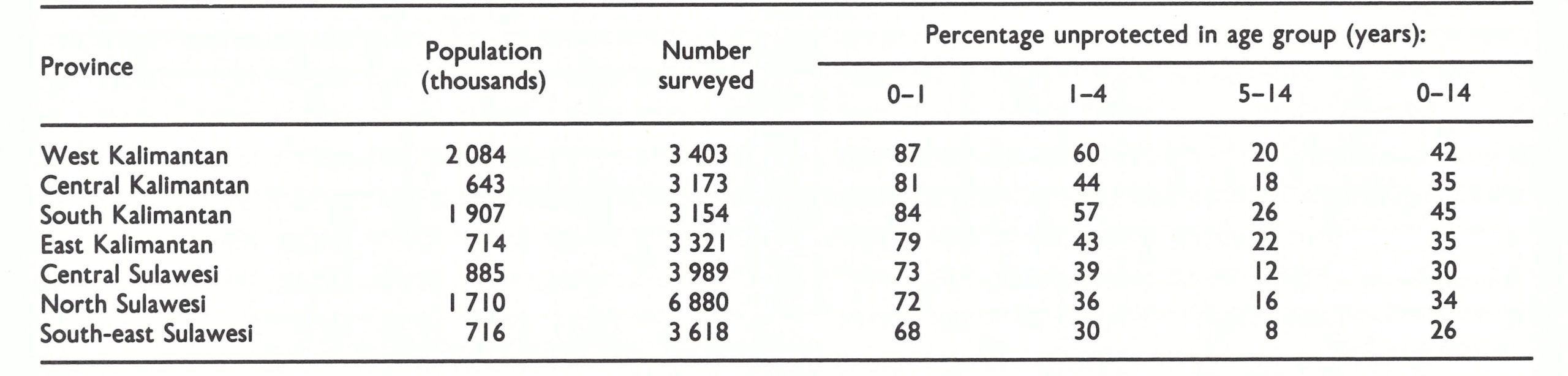 Programme staff at the time speculated that natural immunity induced by the epidemic, combined with extensive vaccination, had so reduced the number of susceptible persons that transmission was interrupted even though the surveillance-containment programme was much less effective than in other areas. However, a high level of immunity was not the primary explanation for the interruption of transmission in Kalimantan and in Central, South-east and North Sulawesi, as was shown in a February 1974 survey. At that time, Indonesian staff conducted random cluster sample surveys among children throughout these provinces (Table 13.18) (WHO/SE/74.66, Cuboni et al.). In most provinces, more than one-third of all children remained susceptible. Immunity levels were substantially below those in most of Java, in which health services were far more extensive.