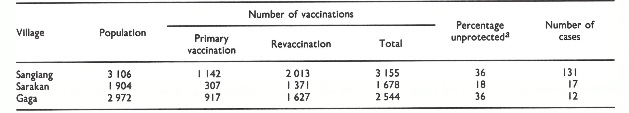 The number of vaccinations given was insufficient to sustain immunity. Jakarta Municipality’s 49 vaccinators had performed 384 000 vaccinations in 1967, but only 35 295 (9.2%) had been primary vaccinations. In a population of 1.4 million, with a birth rate of 40 per 1000, it was calculated that 56 000 primary vaccinations would be required annually simply to protect newborn infants.