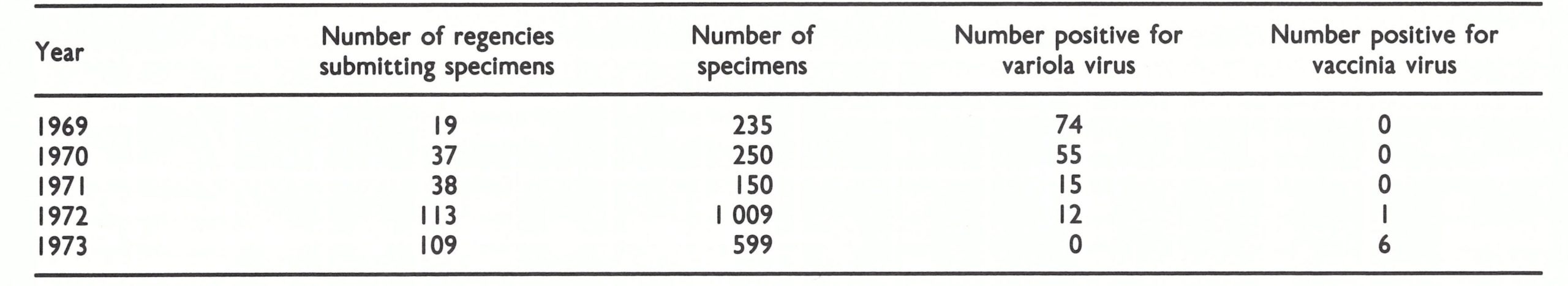 Immediately after the apparent detection of the last case, the 1208 vaccinators in Sulawesi, Sumatra and Kalimantan searched village by village during a 4-month period, reaching 18 205 (73.5%) of the 24 781 villages in the process. Although 920 suspected cases were examined and 76 specimens were taken, none revealed the presence of smallpox (WHO/SE/74.63, Cuboni et al.).