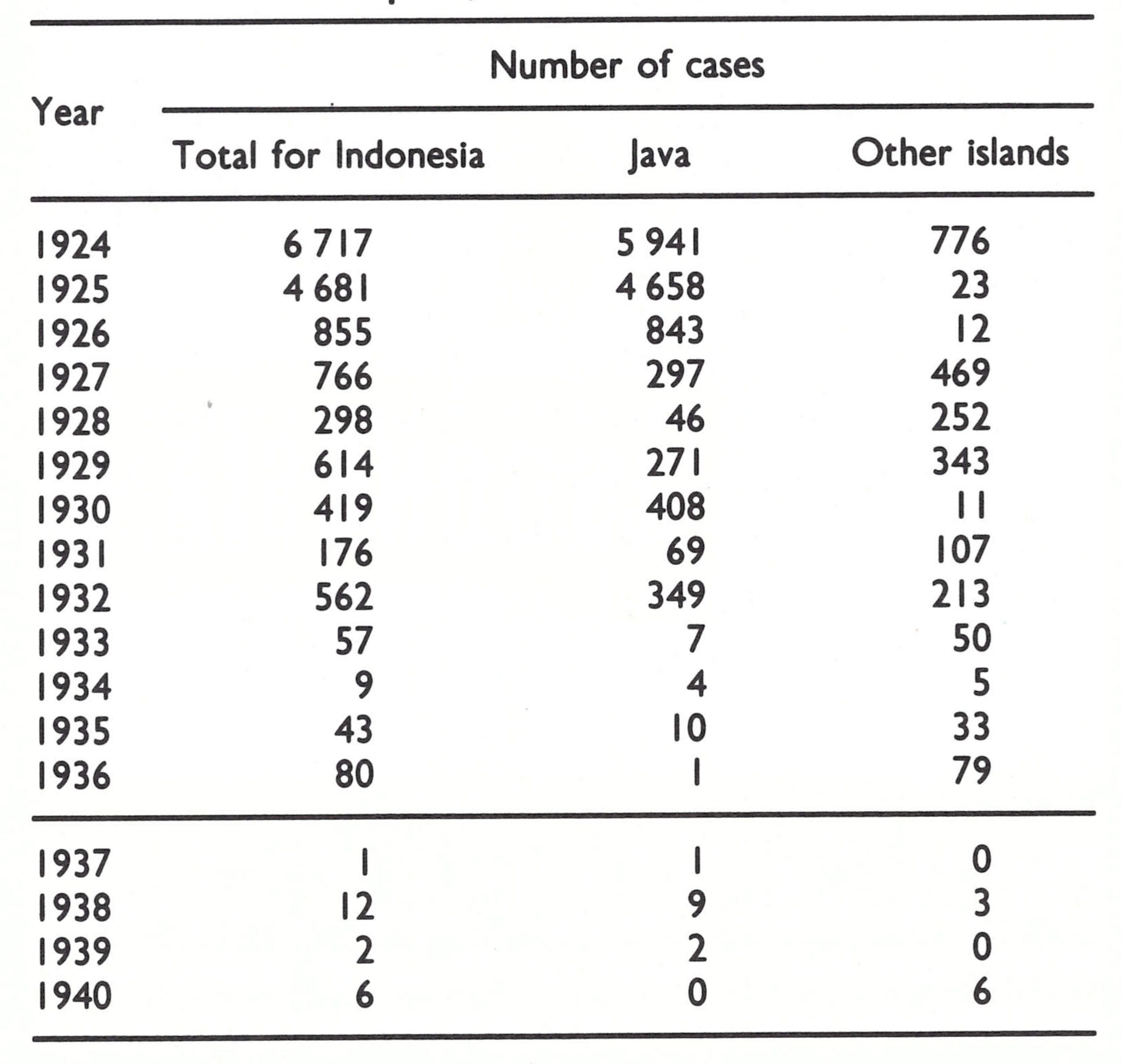 Of the 21 cases recorded between 1937 and 1940, 7 were found to be importations and the others were suspected to be either importations or mistaken diagnoses (Polak, 1968). The Second World War intervened and morbidity reporting ceased. After the war, no Of the 21 cases recorded between 1937 and 1940, 7 were found to be importations and the others were suspected to be either importations or mistaken diagnoses (Polak, 1968). The Second World War intervened and morbidity reporting ceased. After the war, no cases are known to have occurred in Indonesia until May 1947. The first cases were reported from the Riau Islands, adjacent to Malaysia, in which smallpox was then endemic. Over the next few years, the disease swept eastwards across the western and central islands of the archipelago, 99 016 cases being reported in 1950. However, smallpox did not spread beyond Sulawesi and West Nusa Tenggara to the numerous but more sparsely populated islands to the east-East Nusa Tenggara, Maluku and West Irian (Fig. 13.3).