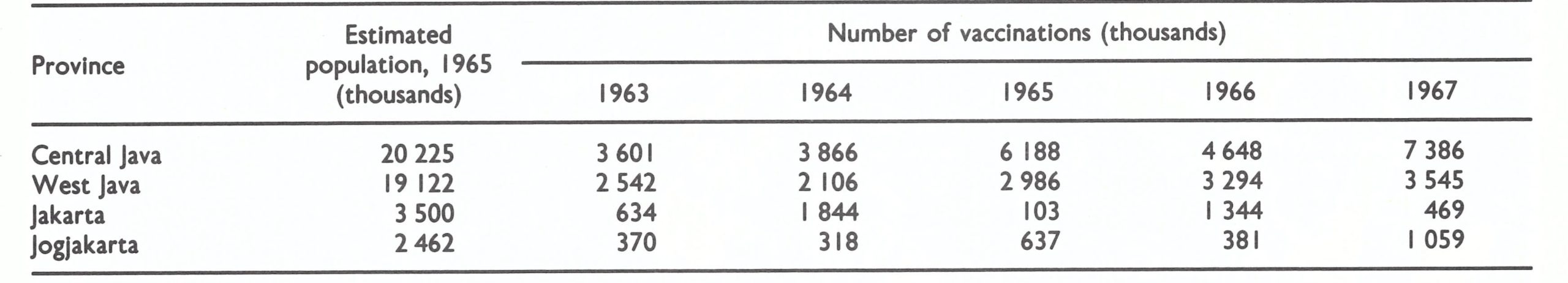 Special mass vaccination campaigns had been conducted in Jakarta in 1962-1963, in East Java in 1964, in West Java in 1965 and in Central Java beginning in the autumn of 1966. The campaigns were not well supervised or well coordinated and were chronically short of funds to pay vaccinators and to purchase vaccines from the Biofarma laboratory.