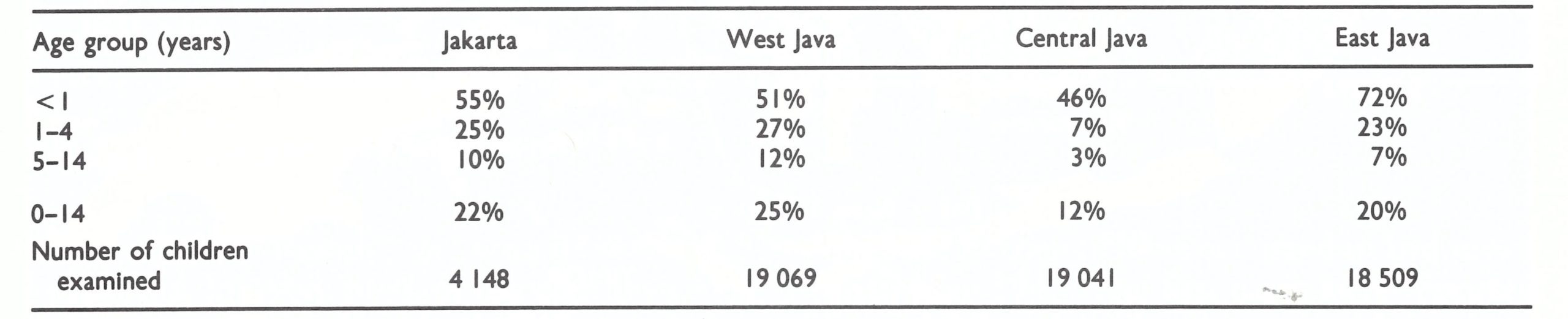 In June 1969 the joint WHO-Indonesia Assessment Team analysed the age distribution of 3823 cases in selected areas and during periods when reporting was considered to be reasonably complete (Table 13.21). The age distributions were similar in West and Central Java and Jakarta, in which smallpox was then endemic. Cases in East Java occurred primarily in outbreaks following importations and the patients were generally older, as was the case in other non-endemic areas. Excluding the data for East Java, 68% of cases occurred in children aged 0—4 years, a group which comprised only 18% of the population of the country. A surprisingly high incidence—about 12%—was found in infants under 1 year of age, twice the proportion recorded in India.