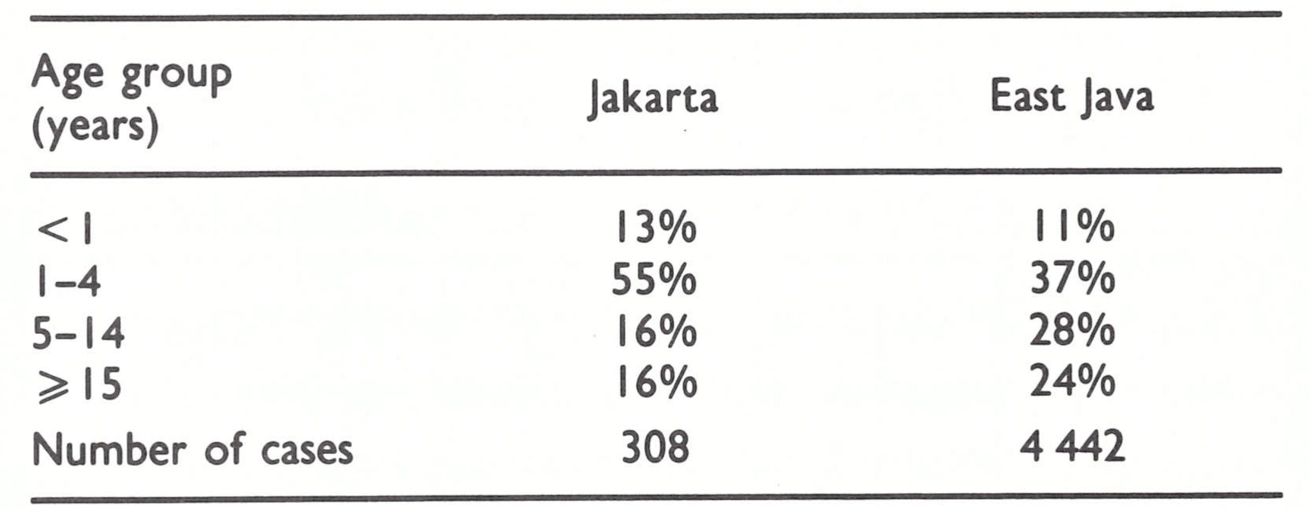 In Java, more than half of all cases were found in children under 5 years of age; few cases occurred in adults. In Africa, South America and Asia, cases were more evenly distributed among all age groups.