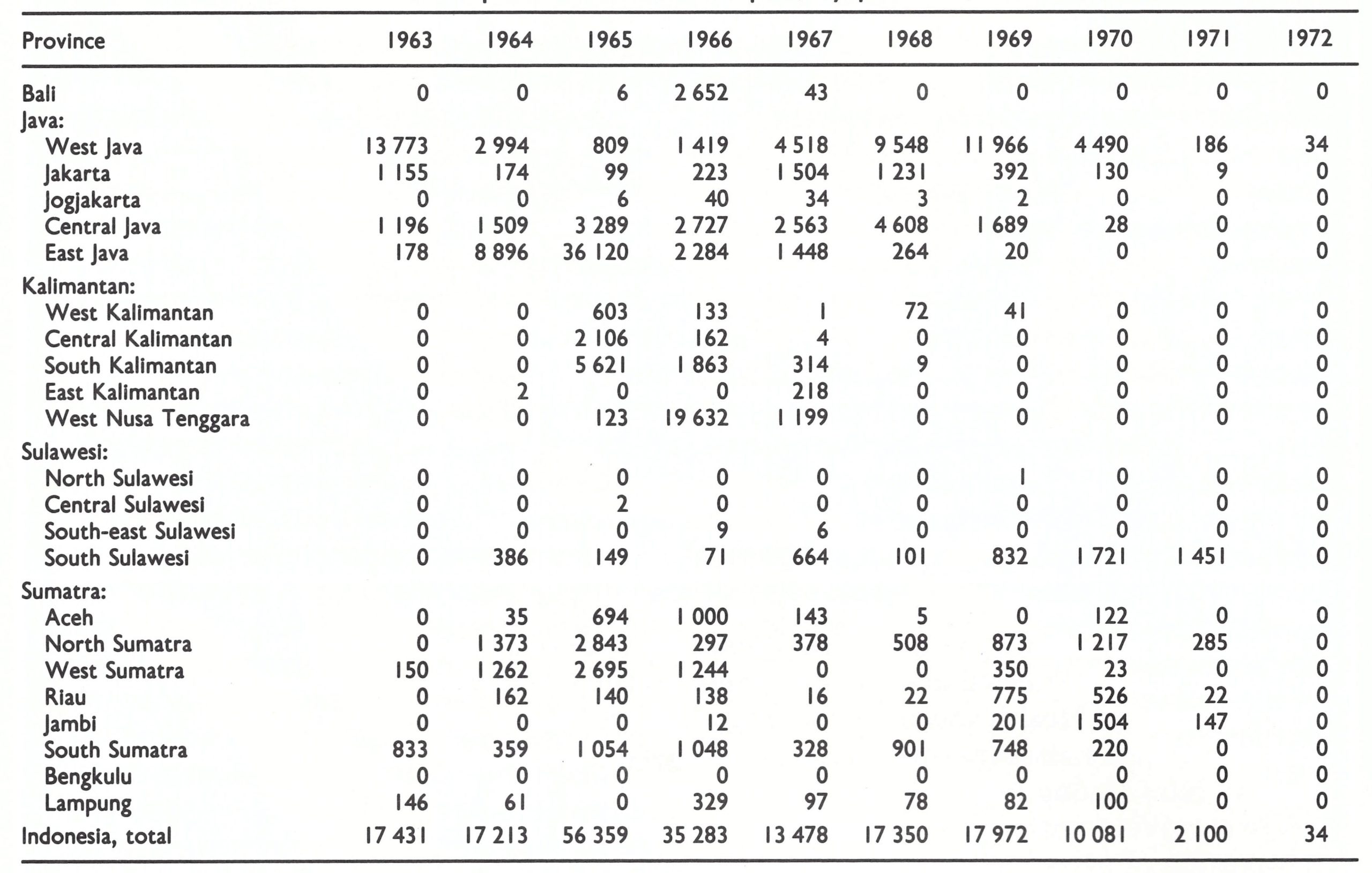 National data for smallpox prior to 1963 provide little indication as to the incidence or geographical distribution of the disease . Not only did villages and regencies fail to report to provincial authorities, but many provincial administrations submitted no reports to the national authorities. The number of cases officially recorded at the national level varied from 1000 to 10 000 during the period 1952-1962. Better data are available for the years 1963-1967, because smallpox control staff visited each of the provinces during 1968 to compile provincial data from previous years in order to obtain baseline information. In 1963, 17 431 cases were recorded, of which all but 3658 were from West Java (Table 13.7). The most complete data available pertain to the years 1965-1967, and these show a wider dispersion of smallpox throughout the central and western islands of Indonesia.