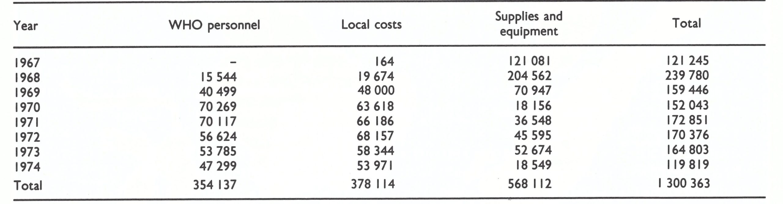 In support of the programme, WHO eventually provided a total of US$1 300 363 to cover the purchase of supplies and equipment, local costs and staff costs (Tables 13.8 and 13.9); it also provided for the acquisition of 4.1 million doses of vaccine. Indonesia’s expenditure amounted to US$3 600 000. The total outlay was equivalent to just over US$0.04 per head of population.