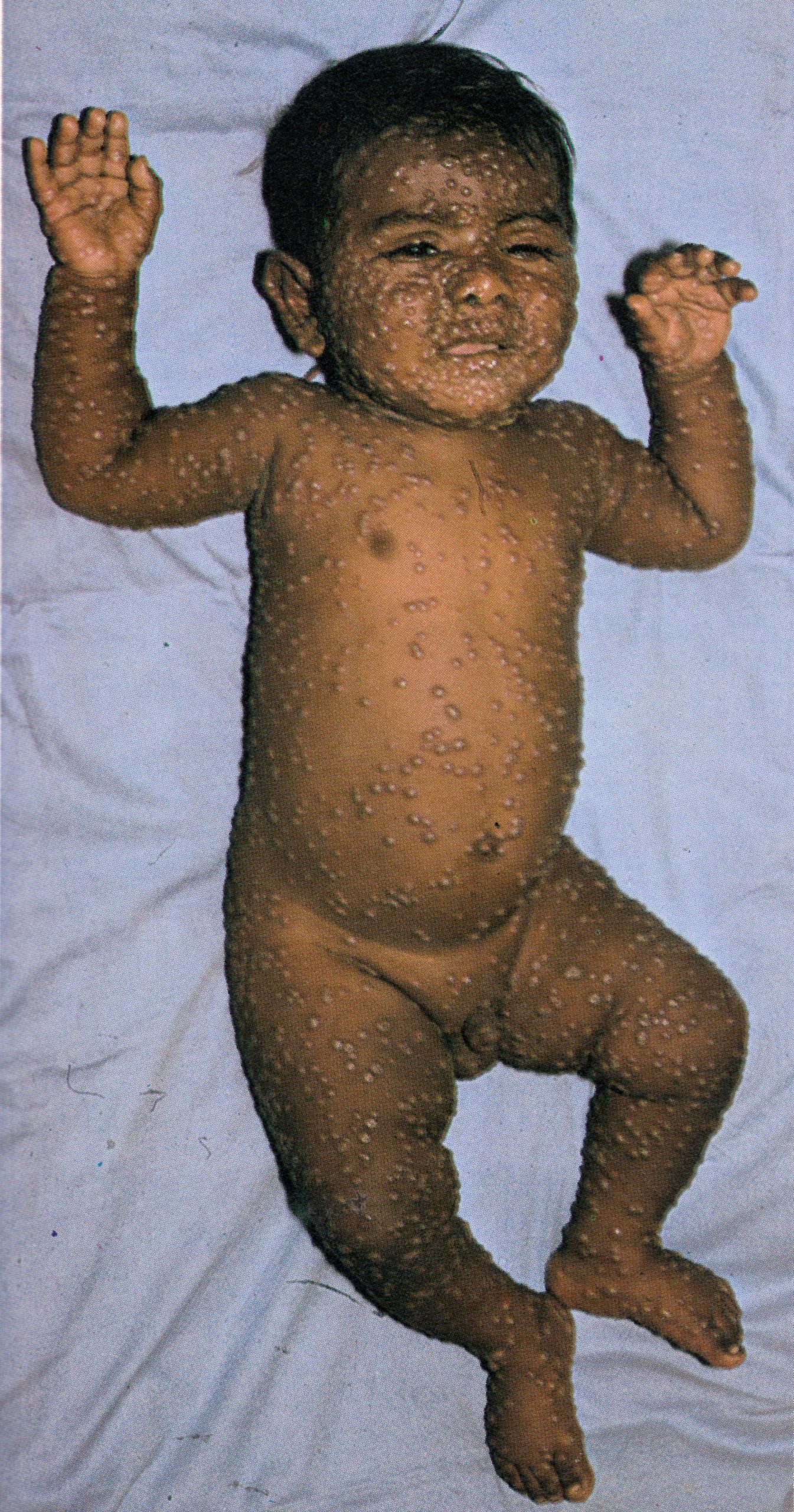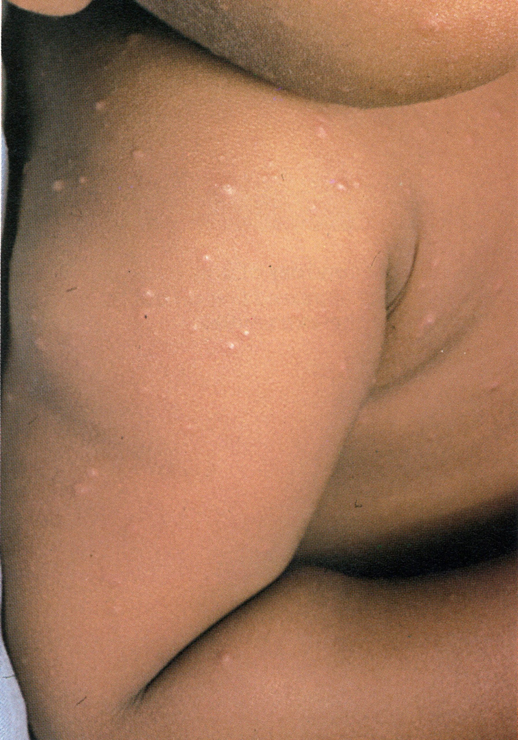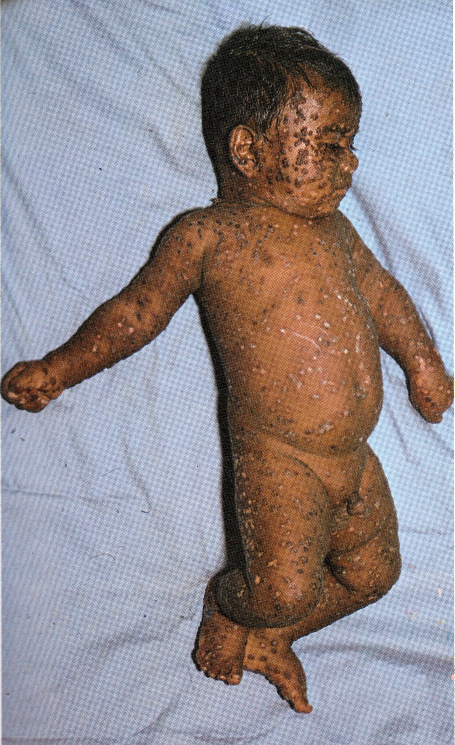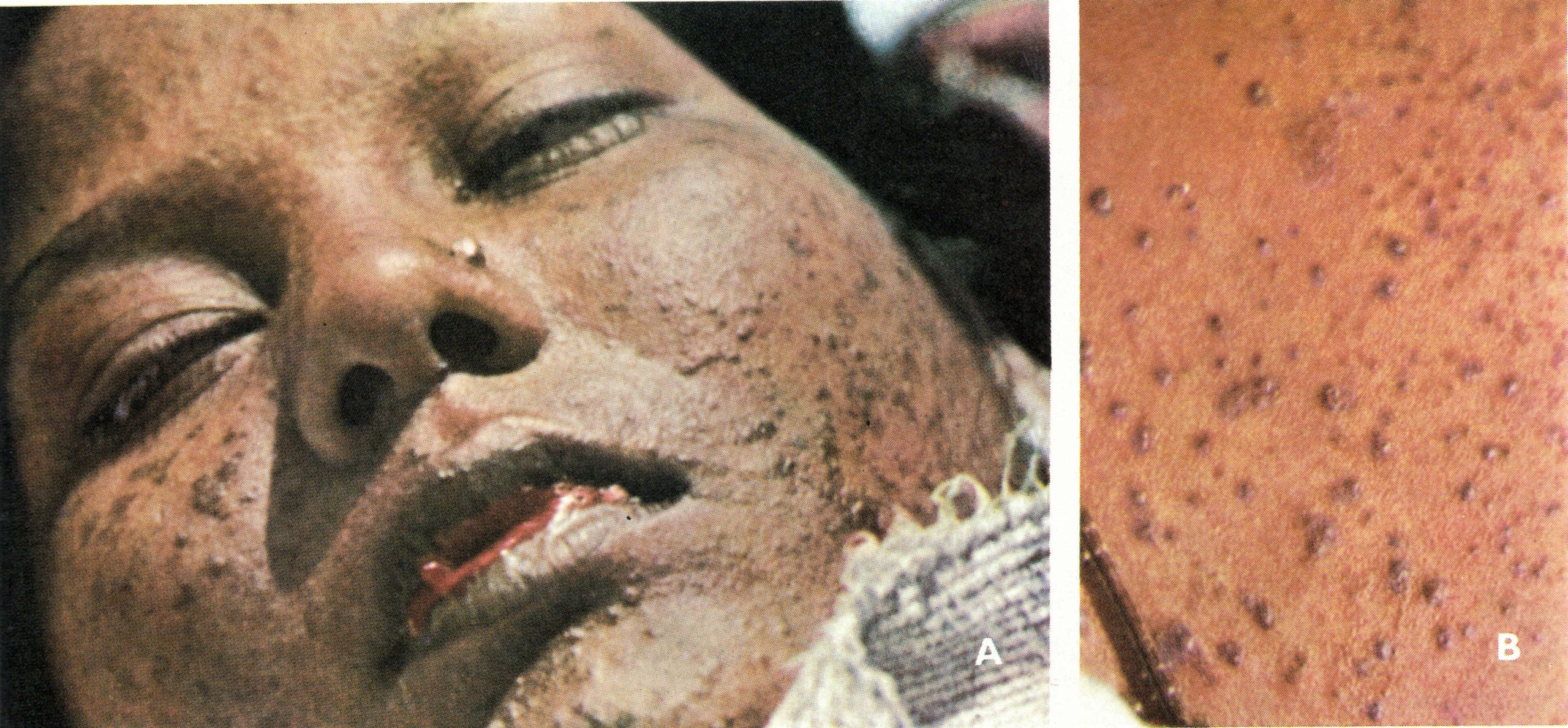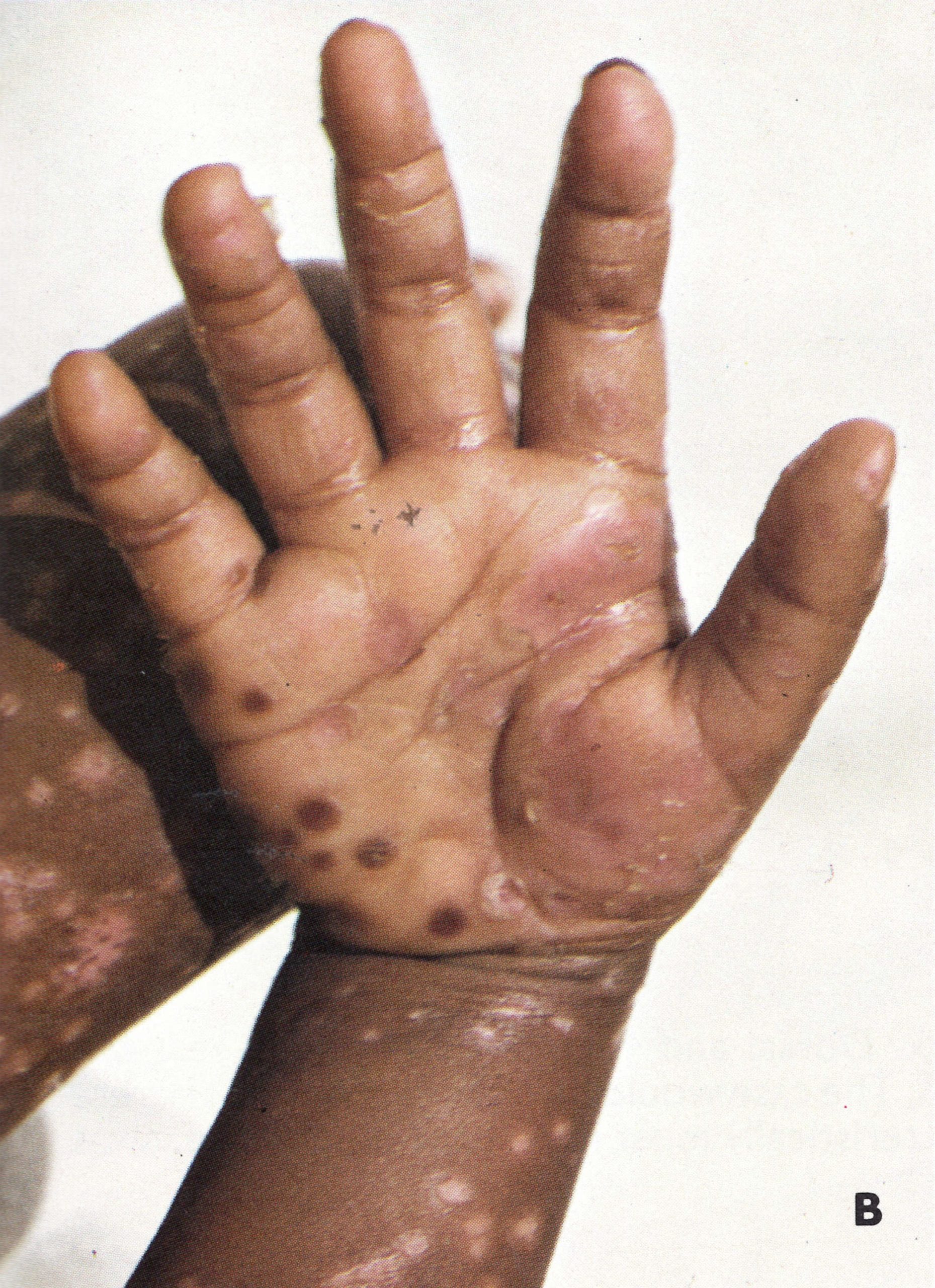 Earlier writers, e.g., Councilman (1907) and Ricketts (1908), paid considerable attention to syphilitic rashes as presenting a problem in differential diagnosis. With the advent of penicillin and the consequent reduction in the incidence of syphilis especially of secondary syphilis-in the developed countries, the disease has ceased even to be mentioned by writers, such as Christie (1980), dealing with the general domain of infectious diseases. However, in African countries and India secondary syphilis remained a disease to be considered in the differential diagnosis of smallpox, up to the time of eradication. The roseolar and papular syphilitic rashes (Plate 1.29B) varied in size and distribution and felt different from those of smallpox. The individual lesions were sometimes hard, but they could not be rolled between the thumb and forefinger, to give the “shotty” feel characteristic of the smallpox vesicle. Neither could they be “split” by passing a needle horizontally through the lesion, as could the vesicles of smallpox. The distribution was also different; if there were a profuse rash on the face, there would also be an equally dense rash on the chest and abdomen and the toxaemia would have been too slight for a case of smallpox with such a rash. Finally, the diagnosis would be clinched by the fact that the papules of syphilis did not evolve further, to vesicles and pustules, like those of smallpox.