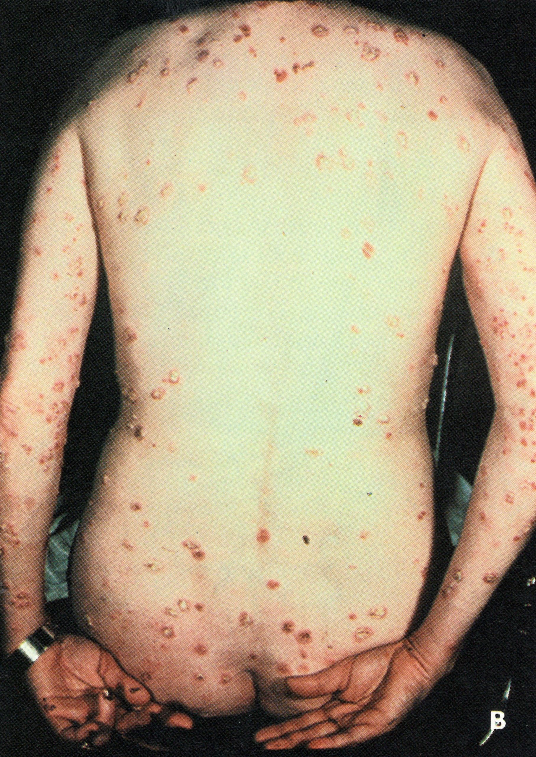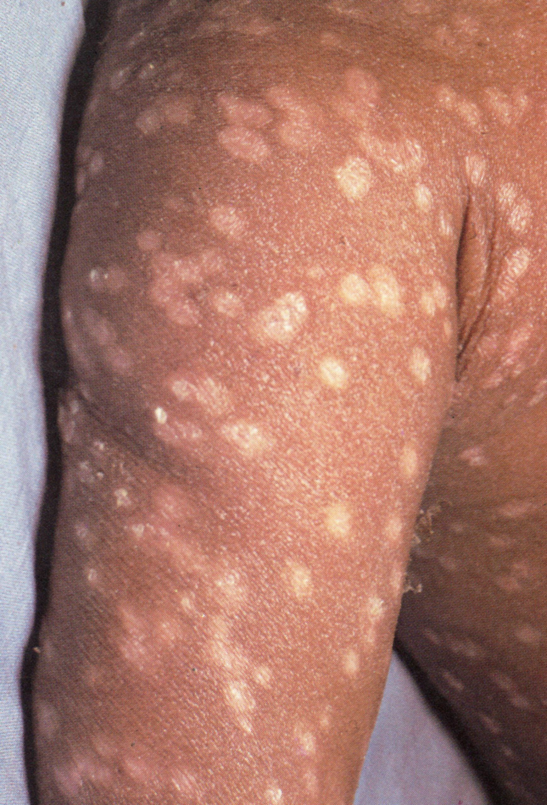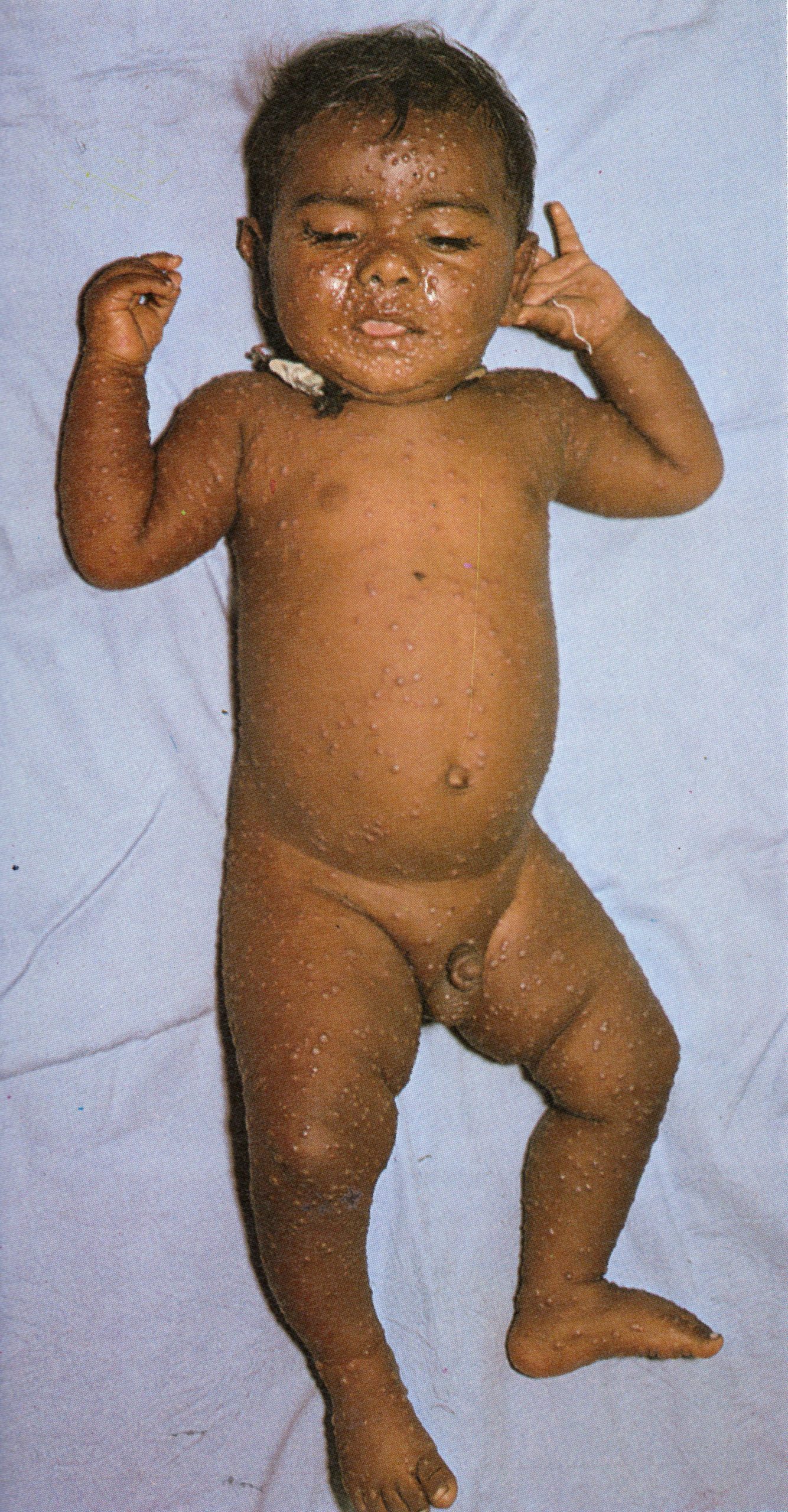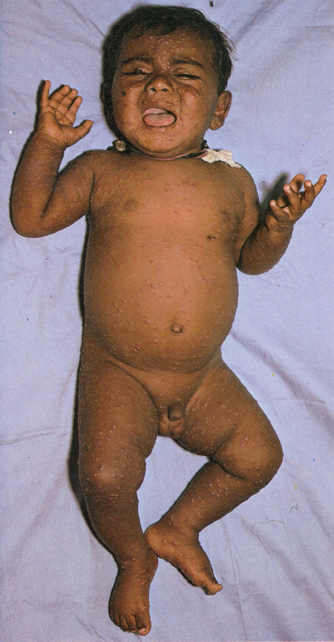 Earlier writers, e.g., Councilman (1907) and Ricketts (1908), paid considerable attention to syphilitic rashes as presenting a problem in differential diagnosis. With the advent of penicillin and the consequent reduction in the incidence of syphilis especially of secondary syphilis-in the developed countries, the disease has ceased even to be mentioned by writers, such as Christie (1980), dealing with the general domain of infectious diseases. However, in African countries and India secondary syphilis remained a disease to be considered in the differential diagnosis of smallpox, up to the time of eradication. The roseolar and papular syphilitic rashes (Plate 1.29B) varied in size and distribution and felt different from those of smallpox. The individual lesions were sometimes hard, but they could not be rolled between the thumb and forefinger, to give the “shotty” feel characteristic of the smallpox vesicle. Neither could they be “split” by passing a needle horizontally through the lesion, as could the vesicles of smallpox. The distribution was also different; if there were a profuse rash on the face, there would also be an equally dense rash on the chest and abdomen and the toxaemia would have been too slight for a case of smallpox with such a rash. Finally, the diagnosis would be clinched by the fact that the papules of syphilis did not evolve further, to vesicles and pustules, like those of smallpox.