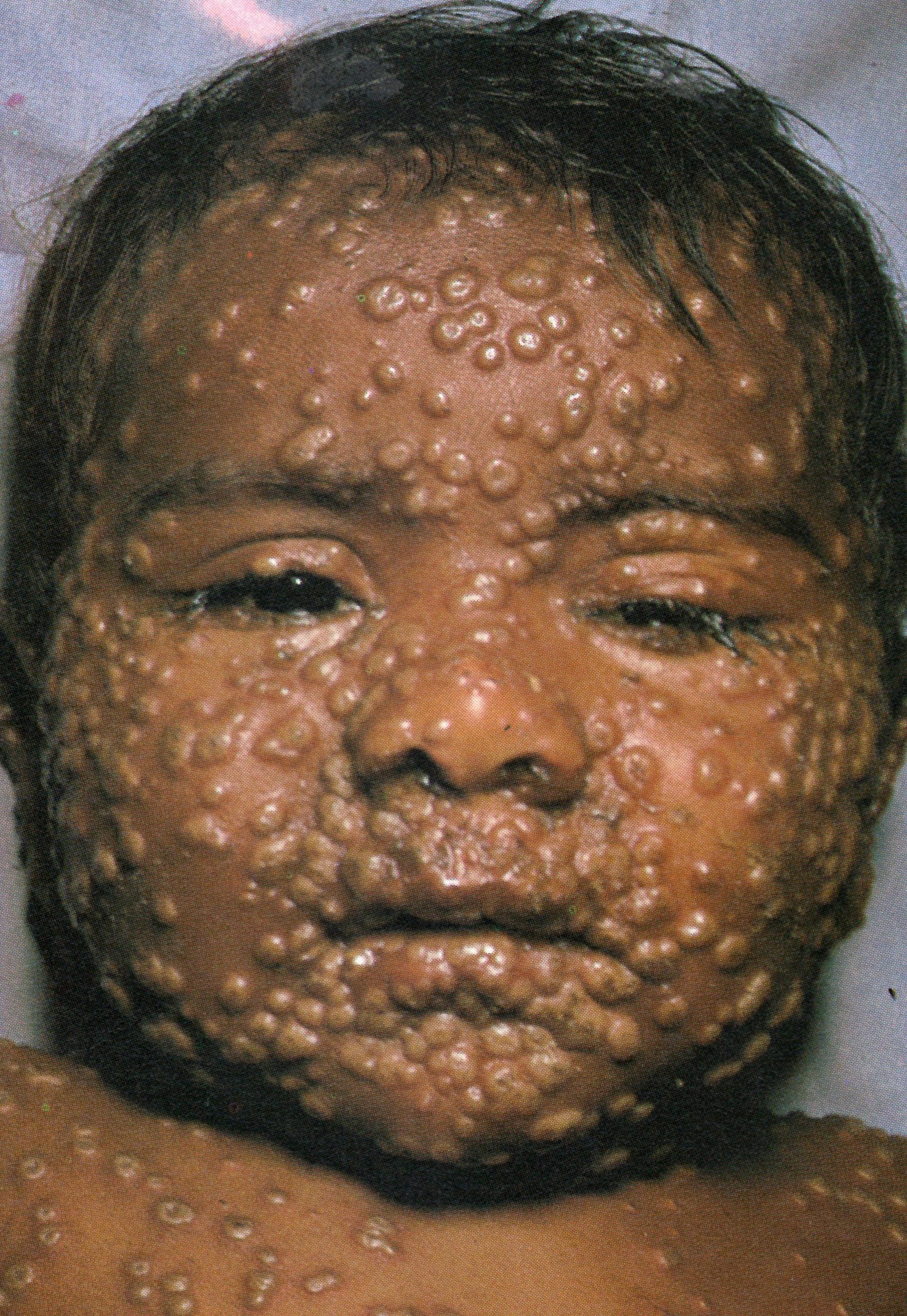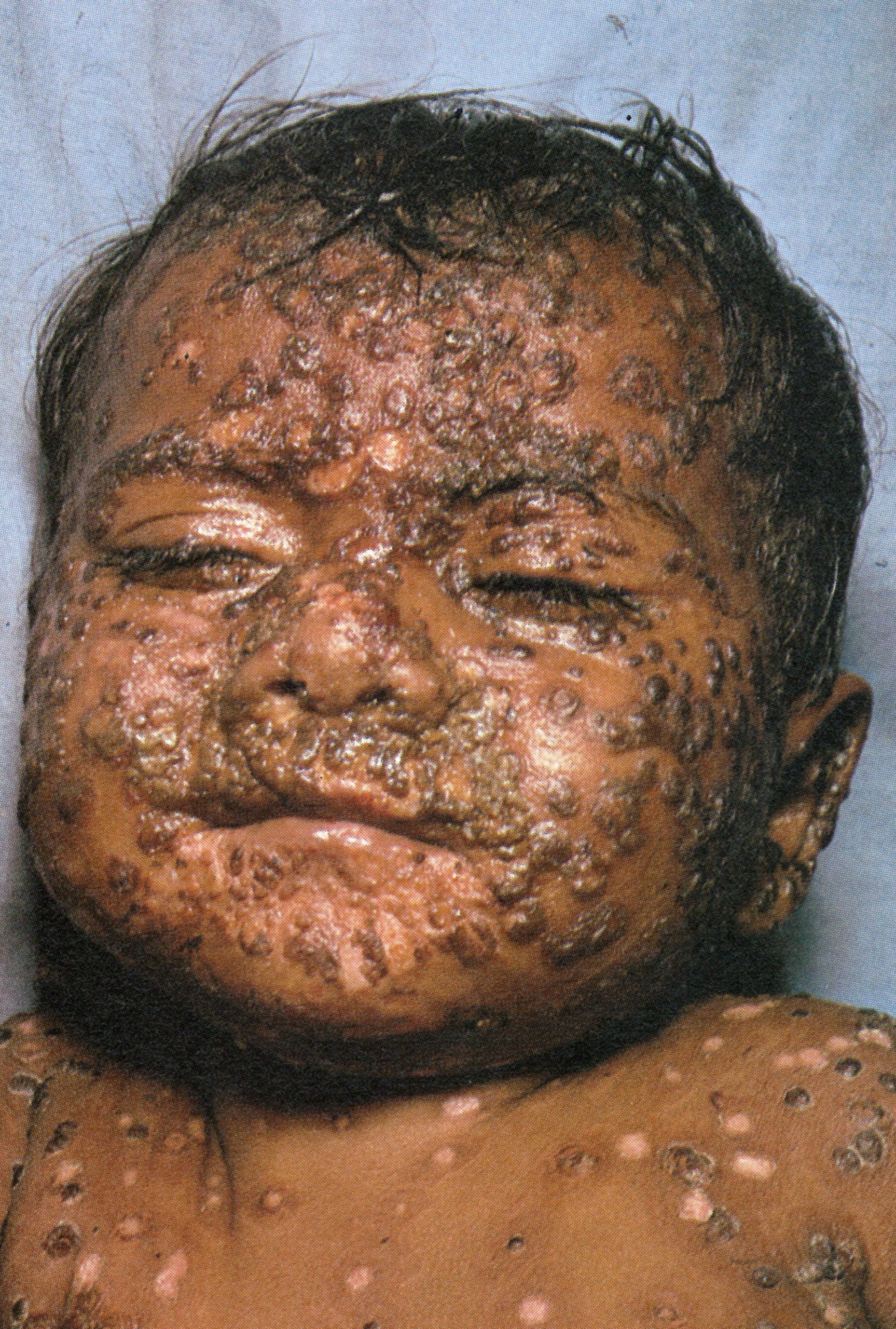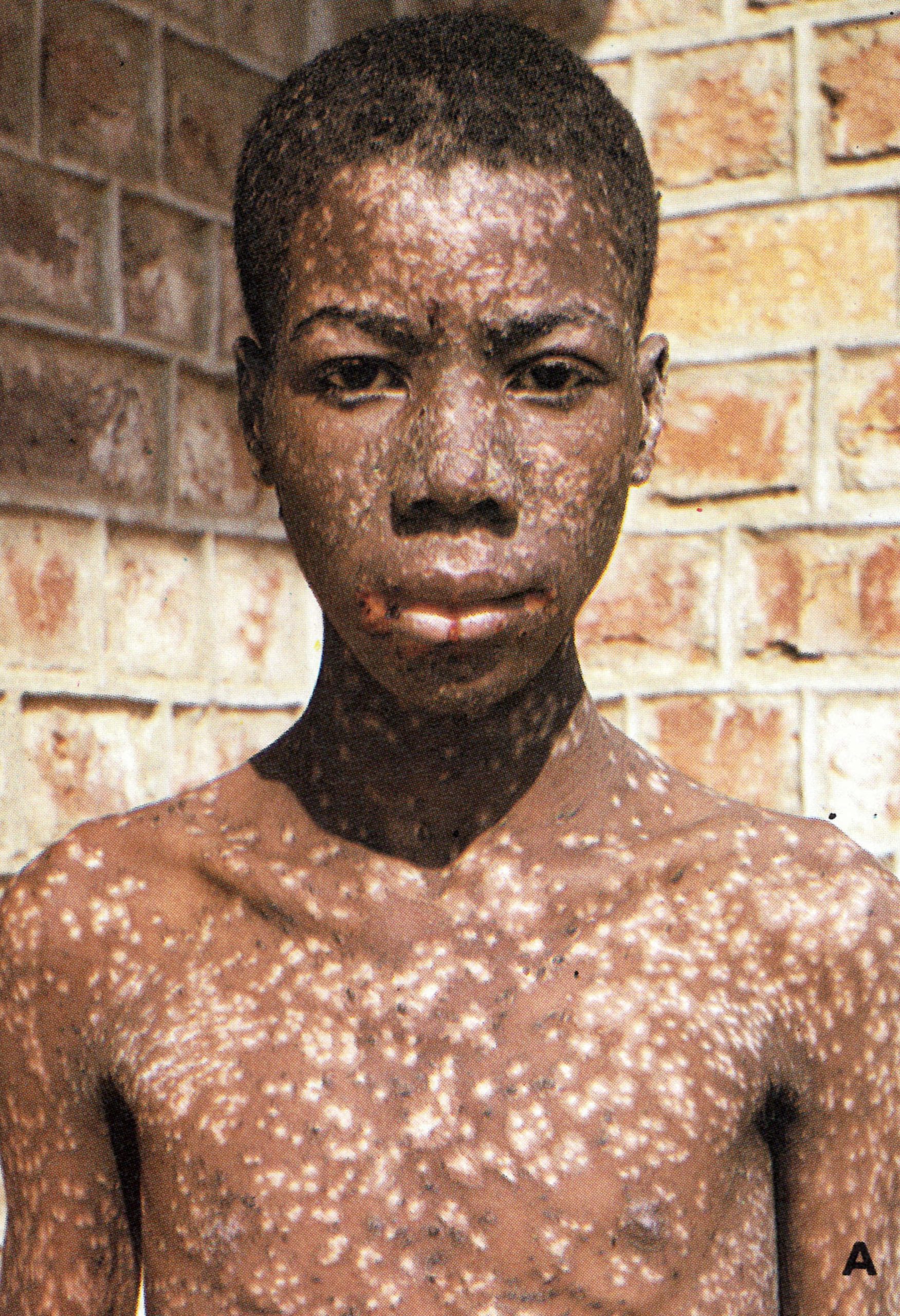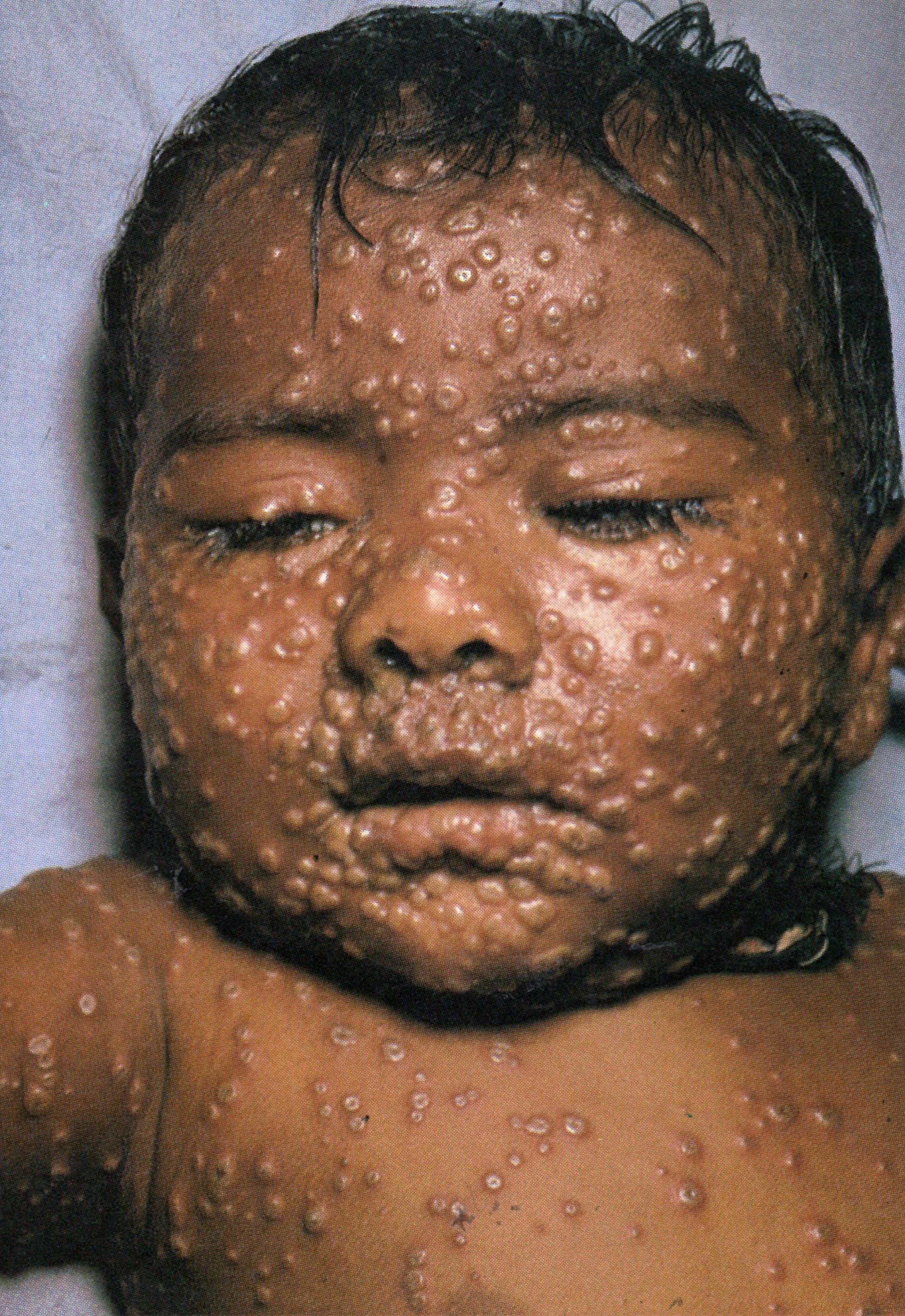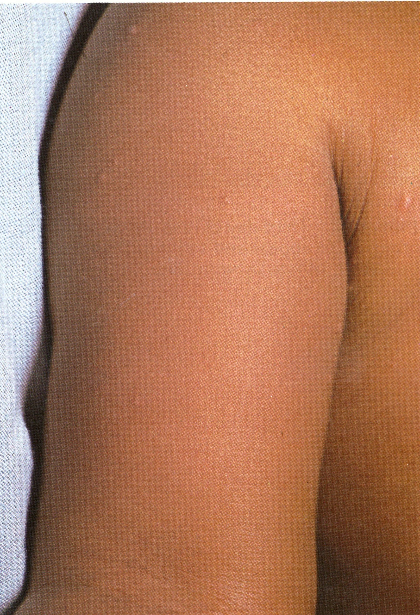 Earlier writers, e.g., Councilman (1907) and Ricketts (1908), paid considerable attention to syphilitic rashes as presenting a problem in differential diagnosis. With the advent of penicillin and the consequent reduction in the incidence of syphilis especially of secondary syphilis-in the developed countries, the disease has ceased even to be mentioned by writers, such as Christie (1980), dealing with the general domain of infectious diseases. However, in African countries and India secondary syphilis remained a disease to be considered in the differential diagnosis of smallpox, up to the time of eradication. The roseolar and papular syphilitic rashes (Plate 1.29B) varied in size and distribution and felt different from those of smallpox. The individual lesions were sometimes hard, but they could not be rolled between the thumb and forefinger, to give the “shotty” feel characteristic of the smallpox vesicle. Neither could they be “split” by passing a needle horizontally through the lesion, as could the vesicles of smallpox. The distribution was also different; if there were a profuse rash on the face, there would also be an equally dense rash on the chest and abdomen and the toxaemia would have been too slight for a case of smallpox with such a rash. Finally, the diagnosis would be clinched by the fact that the papules of syphilis did not evolve further, to vesicles and pustules, like those of smallpox.