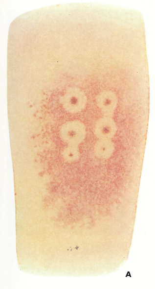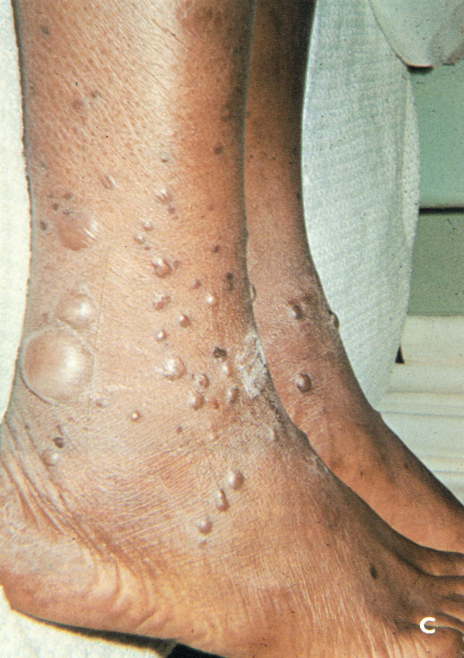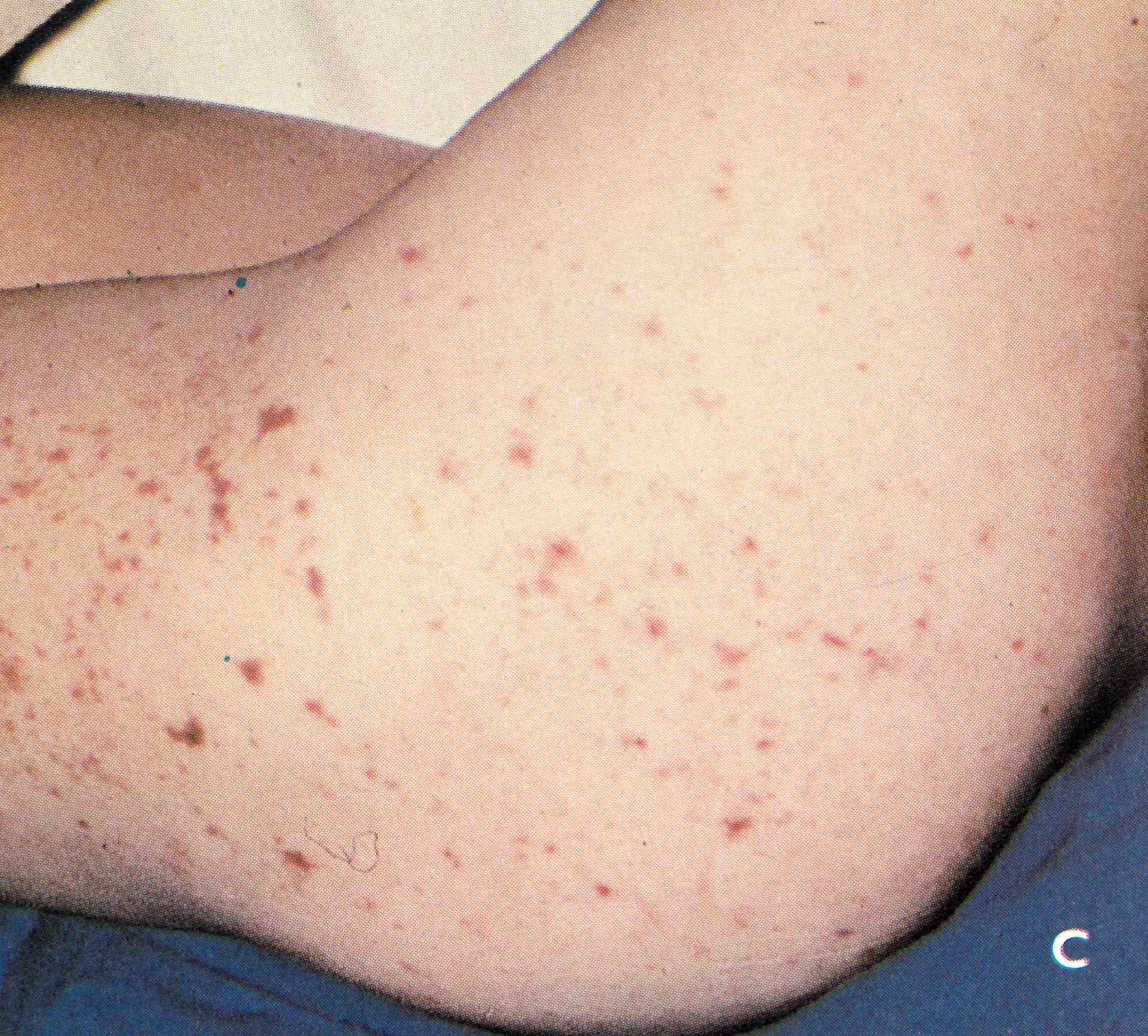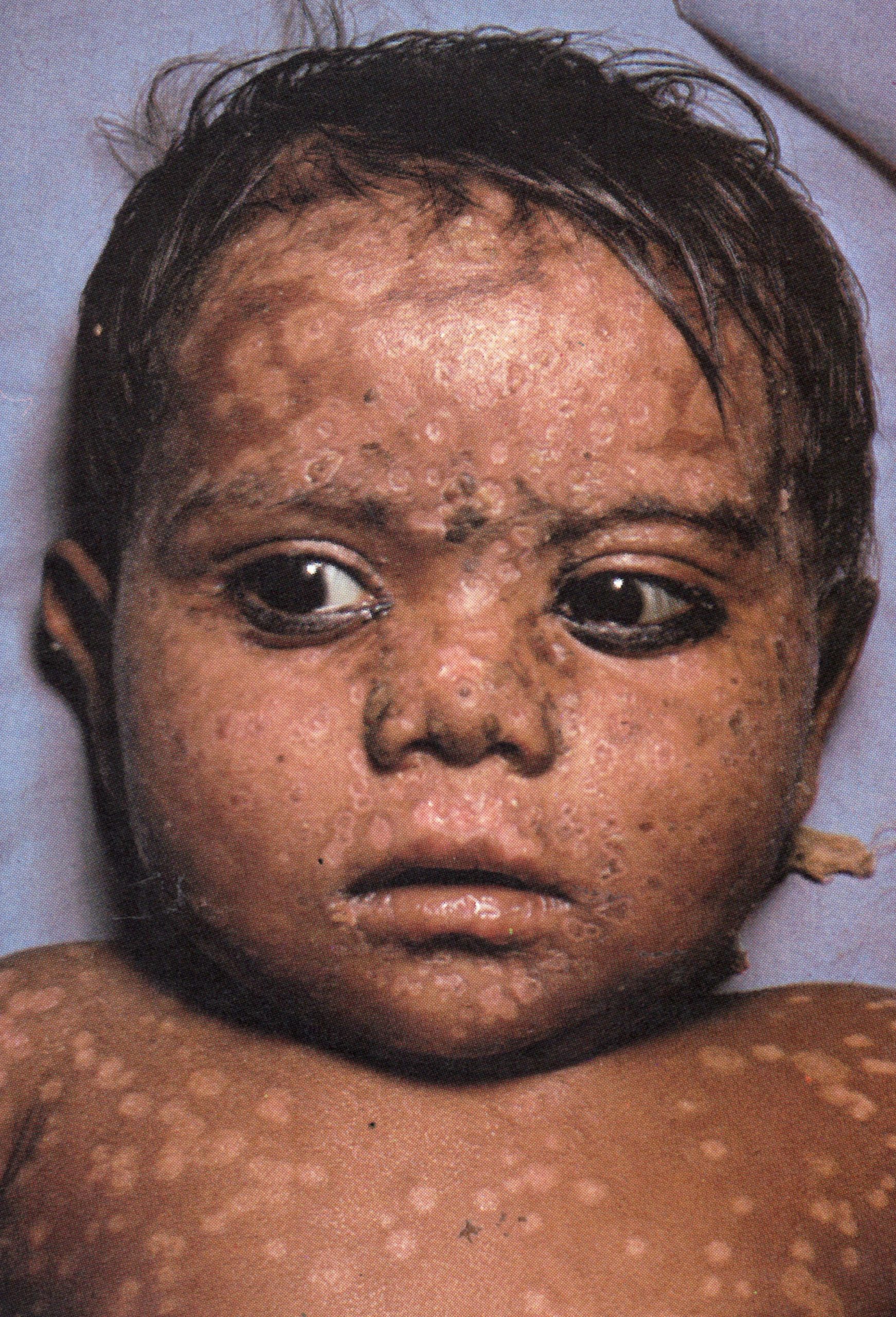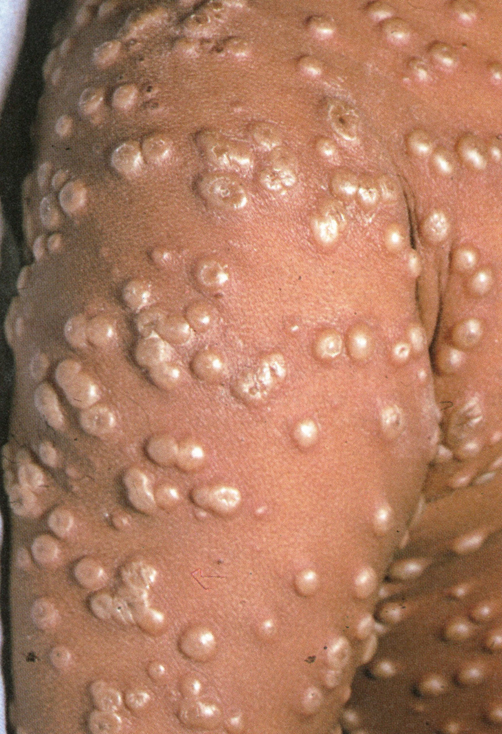 Earlier writers, e.g., Councilman (1907) and Ricketts (1908), paid considerable attention to syphilitic rashes as presenting a problem in differential diagnosis. With the advent of penicillin and the consequent reduction in the incidence of syphilis especially of secondary syphilis-in the developed countries, the disease has ceased even to be mentioned by writers, such as Christie (1980), dealing with the general domain of infectious diseases. However, in African countries and India secondary syphilis remained a disease to be considered in the differential diagnosis of smallpox, up to the time of eradication. The roseolar and papular syphilitic rashes (Plate 1.29B) varied in size and distribution and felt different from those of smallpox. The individual lesions were sometimes hard, but they could not be rolled between the thumb and forefinger, to give the “shotty” feel characteristic of the smallpox vesicle. Neither could they be “split” by passing a needle horizontally through the lesion, as could the vesicles of smallpox. The distribution was also different; if there were a profuse rash on the face, there would also be an equally dense rash on the chest and abdomen and the toxaemia would have been too slight for a case of smallpox with such a rash. Finally, the diagnosis would be clinched by the fact that the papules of syphilis did not evolve further, to vesicles and pustules, like those of smallpox.