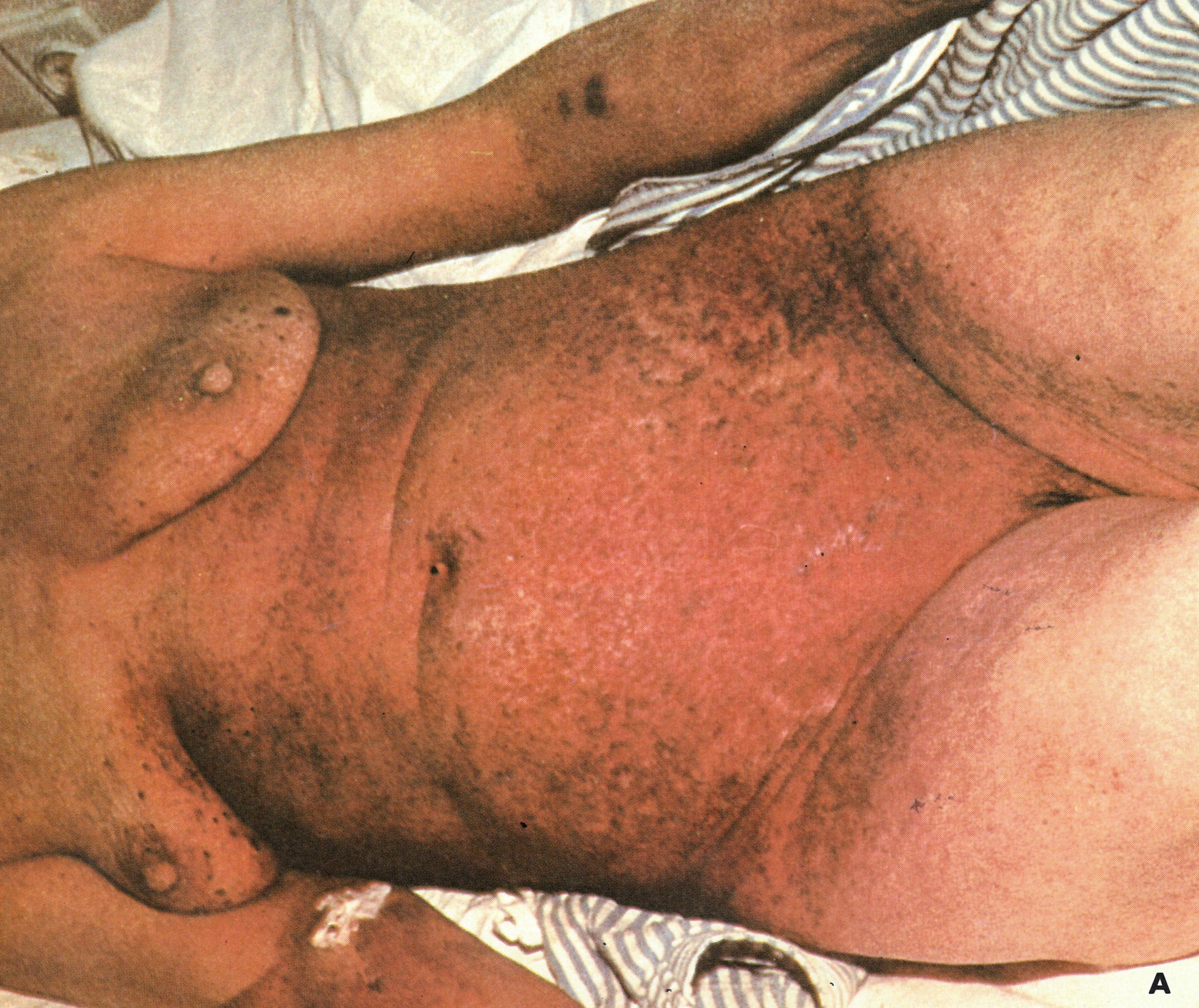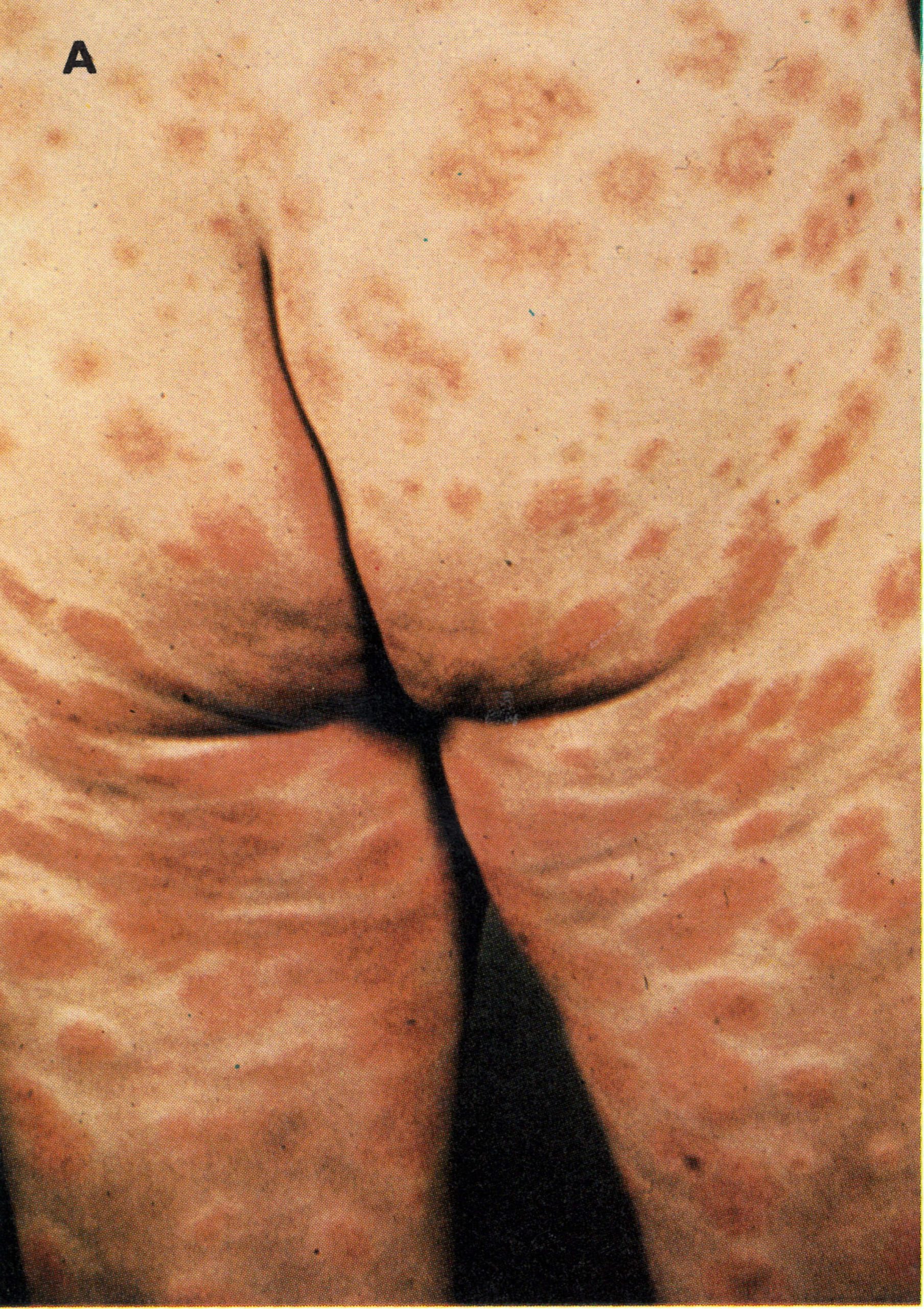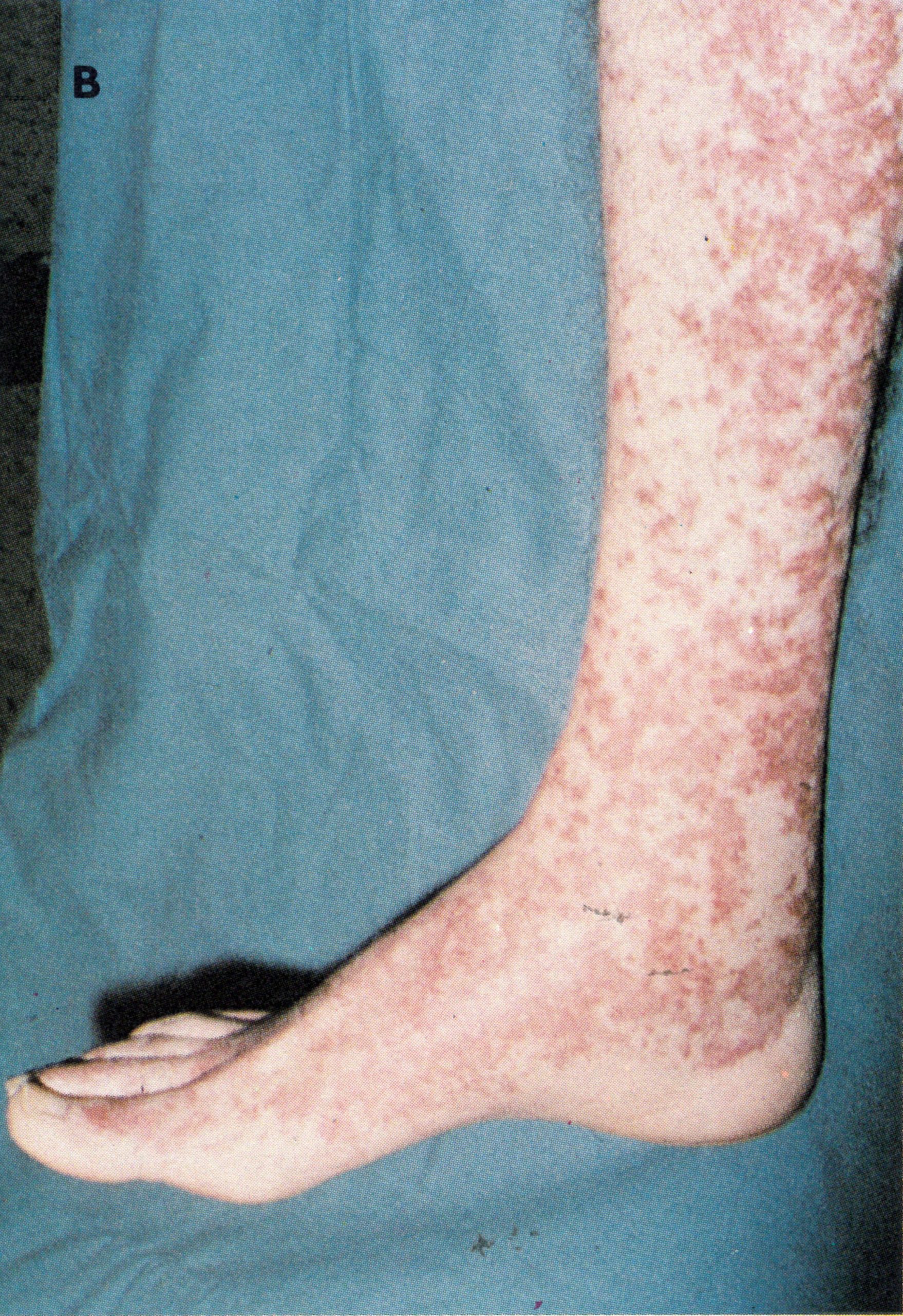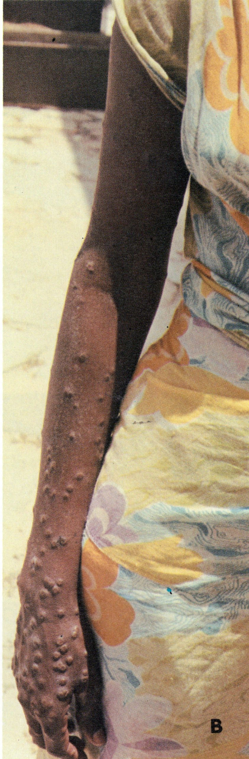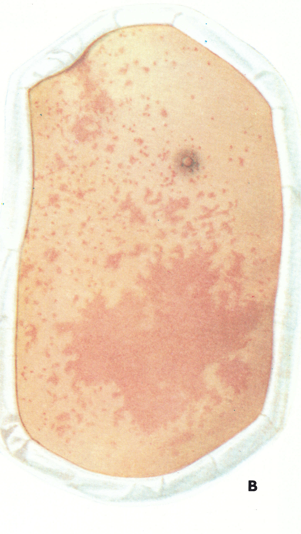 Although less important in countries in which smallpox was still endemic, drug eruptions (Plate 1 .30A and B) were an important diagnostic problem in countries in which smallpox had been eradicated years before and doctors rarely considered the possibility of the disease. Many instances exist in which the rash of an imported case of smallpox, and sometimes the rashes of second-generation cases deriving from it, were diagnosed as drug rashes, since the sick patients had customarily been treated with some kind of drug for the pre-eruptive fever. The diagnosis usually became quite clear with the passage of time and the evolution of the rash, but vaccine-modified smallpox could continue to mislead the physician if he had never considered smallpox as a possible diagnosis.