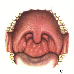 The visible parts of the oropharynx most likely to show lesions were the hard palate, the tip and edges of the tongue and the pillars of the fauces. Different patients showed remarkable variations in the extent of the enanthem; in cases of equal severity the lesions were sometimes few or absent, or the mouth and throat might have been covered by a confluent enanthem that extended to the larynx and trachea. Although not as spectacular as the rash, the pharyngeal lesions were of great importance epidemiologically, as they constituted the major source from which virus was transmitted to other persons (see Chapter 4).