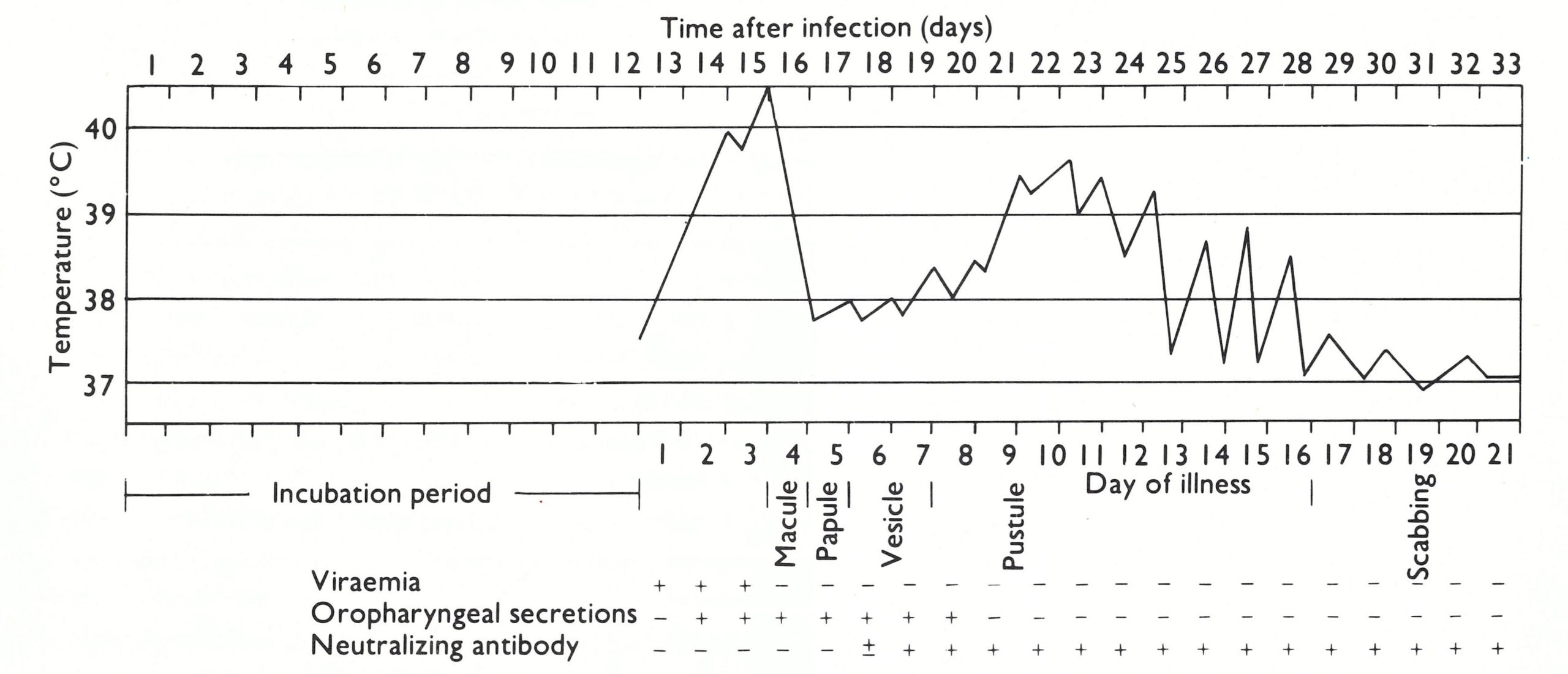 The incubation period is the interval between the implantation of infectious virus and the onset of the first symptoms, which in smallpox were fever and constitutional disturbances. Determination of the length of the incubation period is discussed in detail in Chapter 4; in exceptional instances, the duration, from the time of infection until the onset of fever, was as short as 7 days or as long as 19 days, but in the great majority of cases the period extended over 10-14 days, usually 12 days.