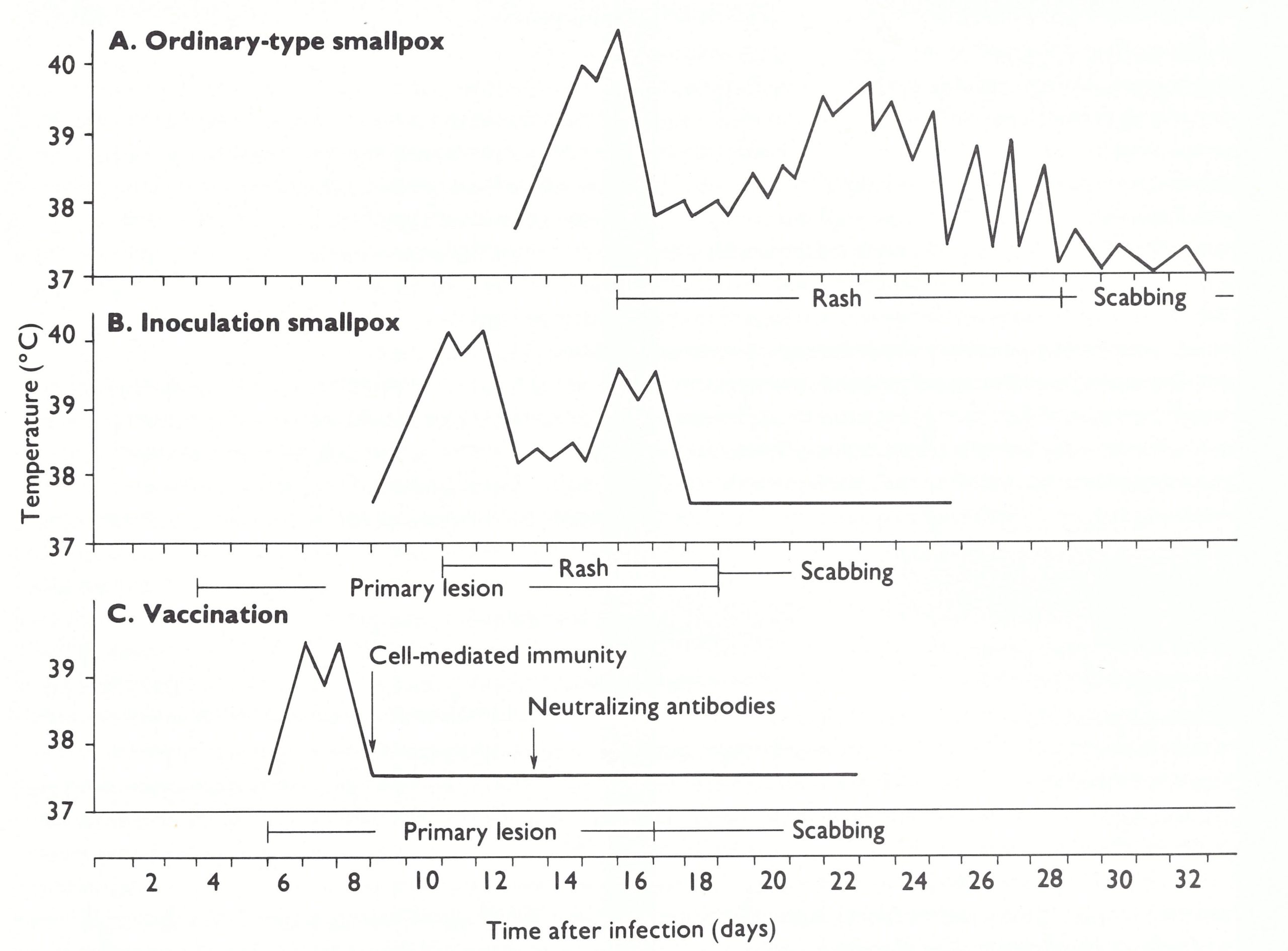 The sheet anchor of smallpox control during the Intensified Smallpox Eradication Programme was surveillance and containment (see Chapter 10). Containment was possible because vaccination provided protection against infection for those who had not already been infected with variola virus. However, vaccination must also be discussed as a form of prophylactic treatment, for it also modified the progress of the disease in persons vaccinated during the first few days of the incubation period. The precedent for this concept was Pasteur’s demonstration of protection against rabies by vaccination during the incubation period. The different timescales of the pathogenesis of vaccinia and variola (see Fig. 1.3 and Fig. 3.1 of Chapter 3) provided hope that such prophylactic treatment, if carried out during the first week of the incubation period of smallpox, might ameliorate or sometimes abort the disease. Precise data were difficult to obtain, because it was rarely known whether or when a contact had actually been infected with variola virus. Unless sophisticated serological tests had been carried out (and this was never done) it would have been impossible to differentiate between a person sustaining only vaccination and one who had also been incubating smallpox but in whom that infection had produced no symptoms. However, all observers agree that persons in whom smallpox developed a week or more after primary vaccination often had a modified attack. Dixon (1962) summarized his review of the older literature by saying that “at least 50 % of cases where successful primary vaccination had occurred during the first week [of the incubation period] will get some vaccine-modification and reduction of severity, whereas when done at a later period the number showing such modification is not likely to be over 20%”. In fact, on theoretical grounds the degree of modification might be expected to be highly dependent on the exact timing of infection with variola virus and vaccination; the more nearly these corresponded, the greater was the degree of protection. Without distinguishing the timing of primary vaccination, Rao (1972) observed a frequency of modified-type smallpox of 8.8% among those given primary vaccination after exposure, compared with 1.0% among unvaccinated patients.