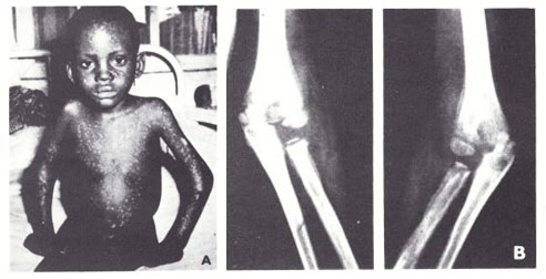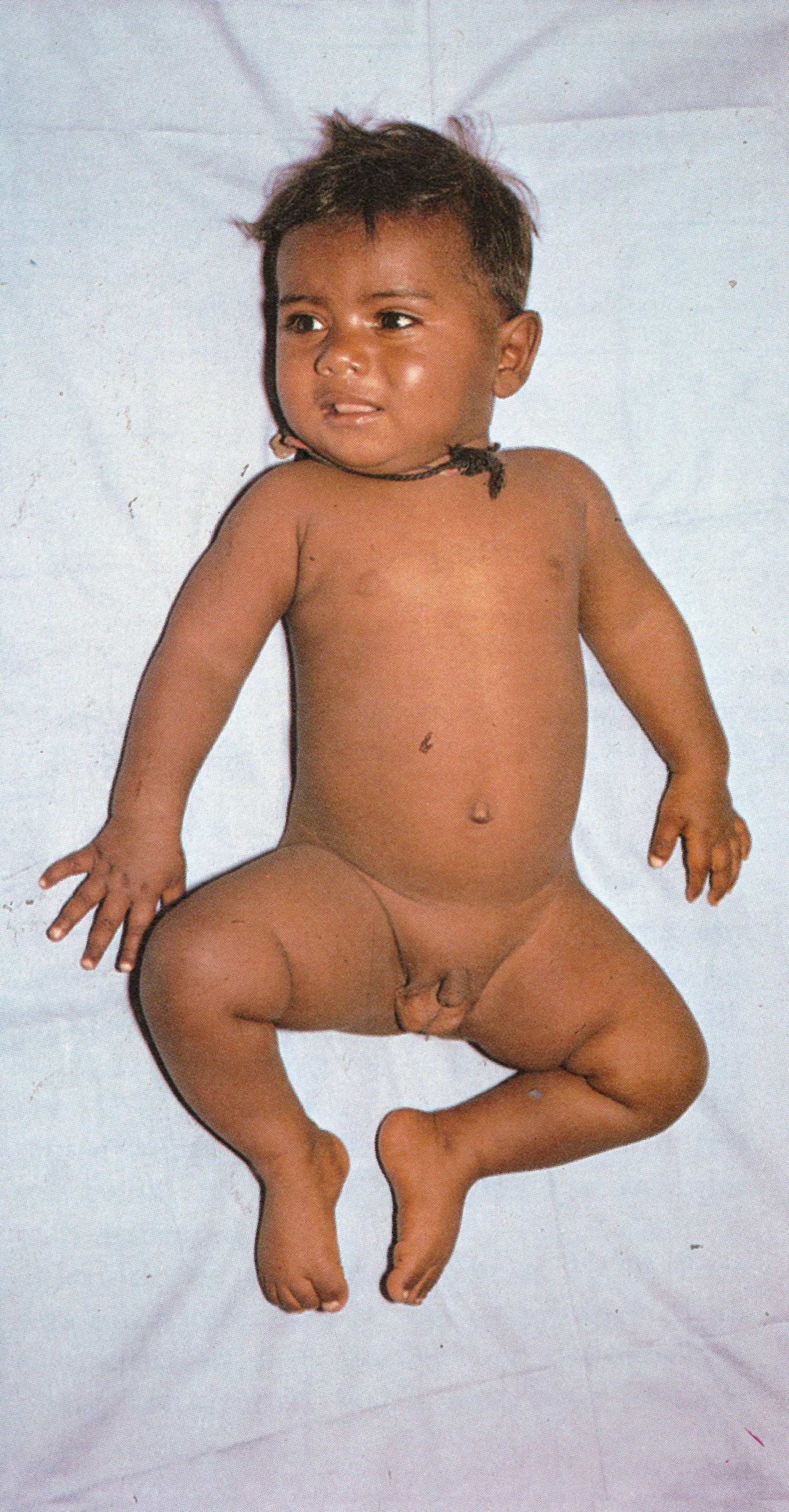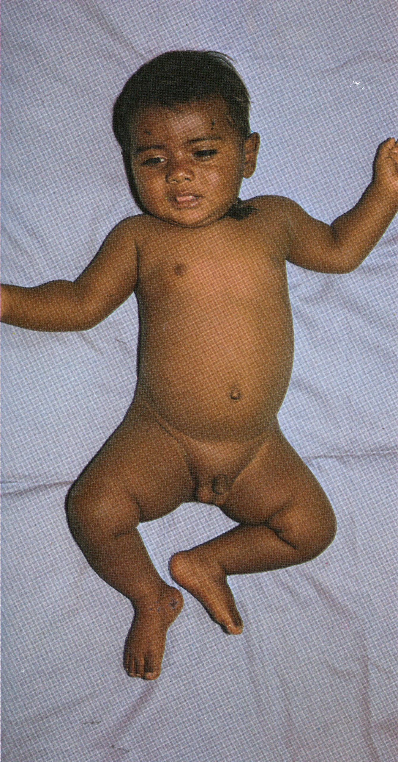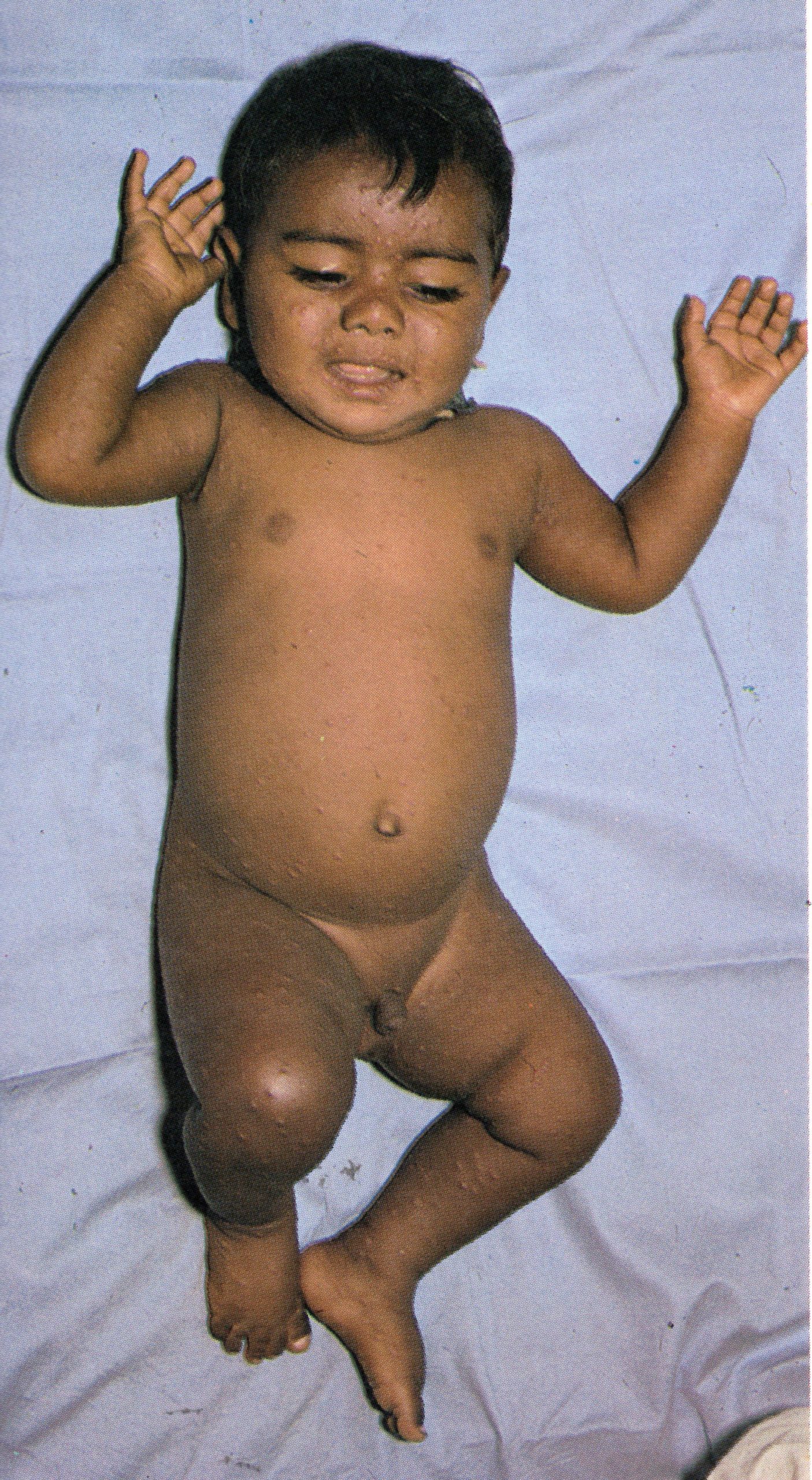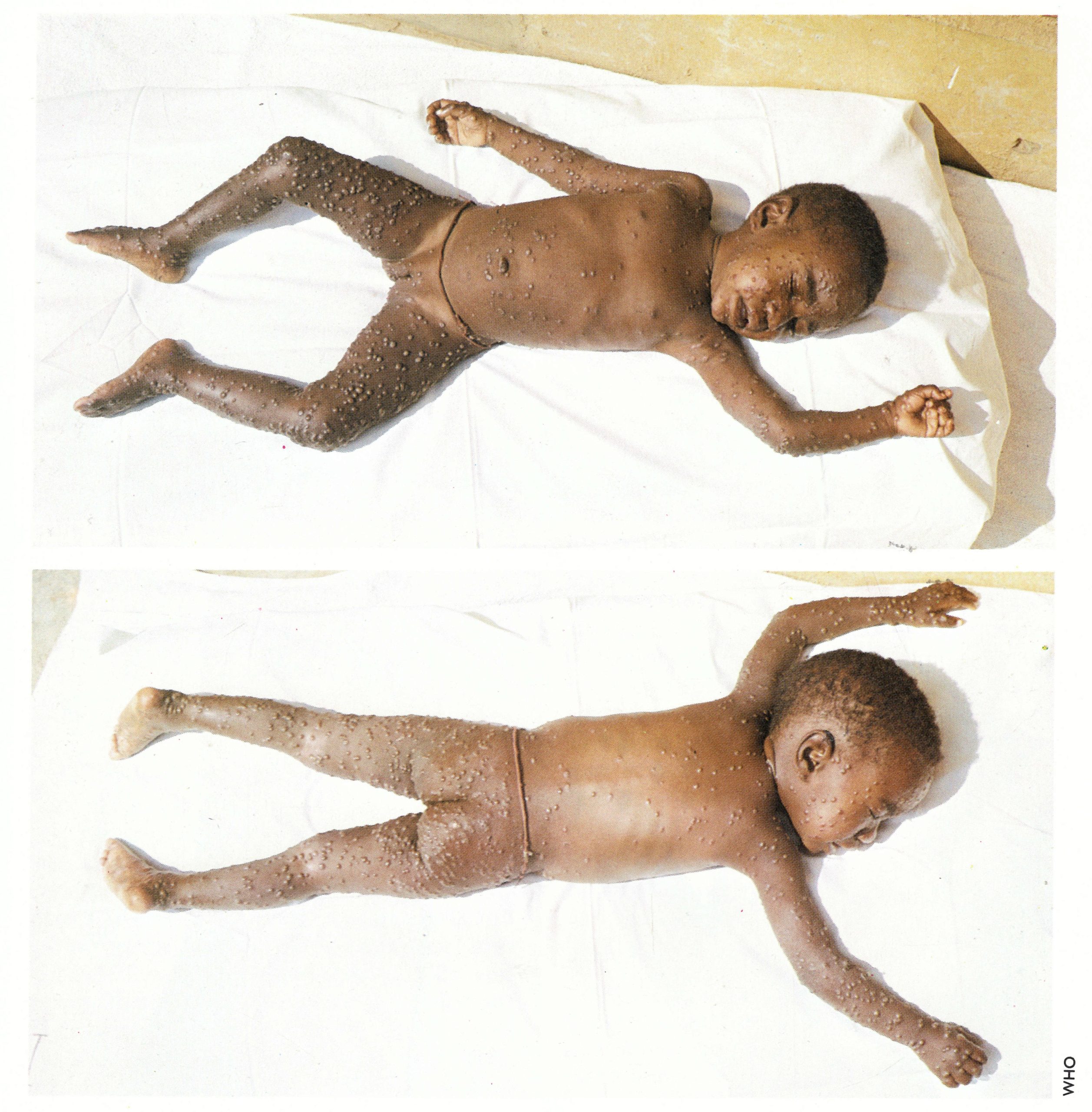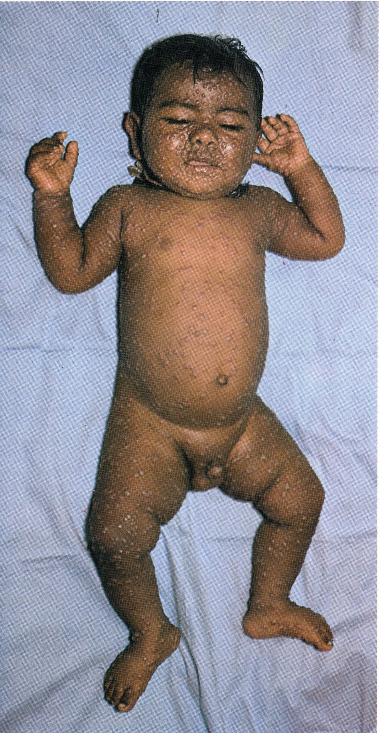 Plate 1.17. Distribution of the rash in smallpox. Dorsal and ventral views of a 3-year-old unvaccinated girl from Zaire, on the 5th day of rash. The case would be classified as mild discrete ordinary-type smallpox. The pustules were characteristically most numerous on the face, arms, and legs and rather sparse on the trunk.