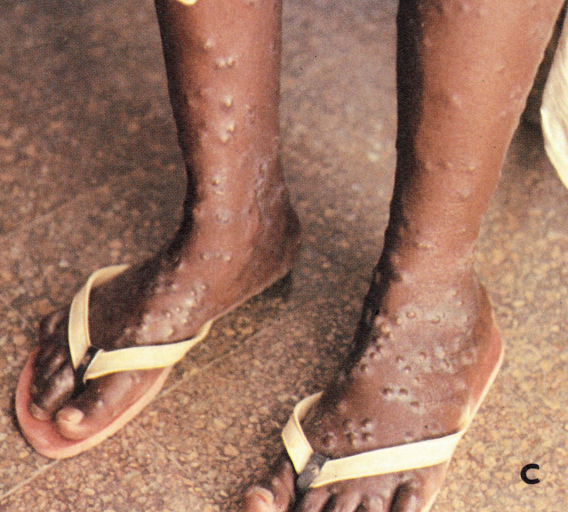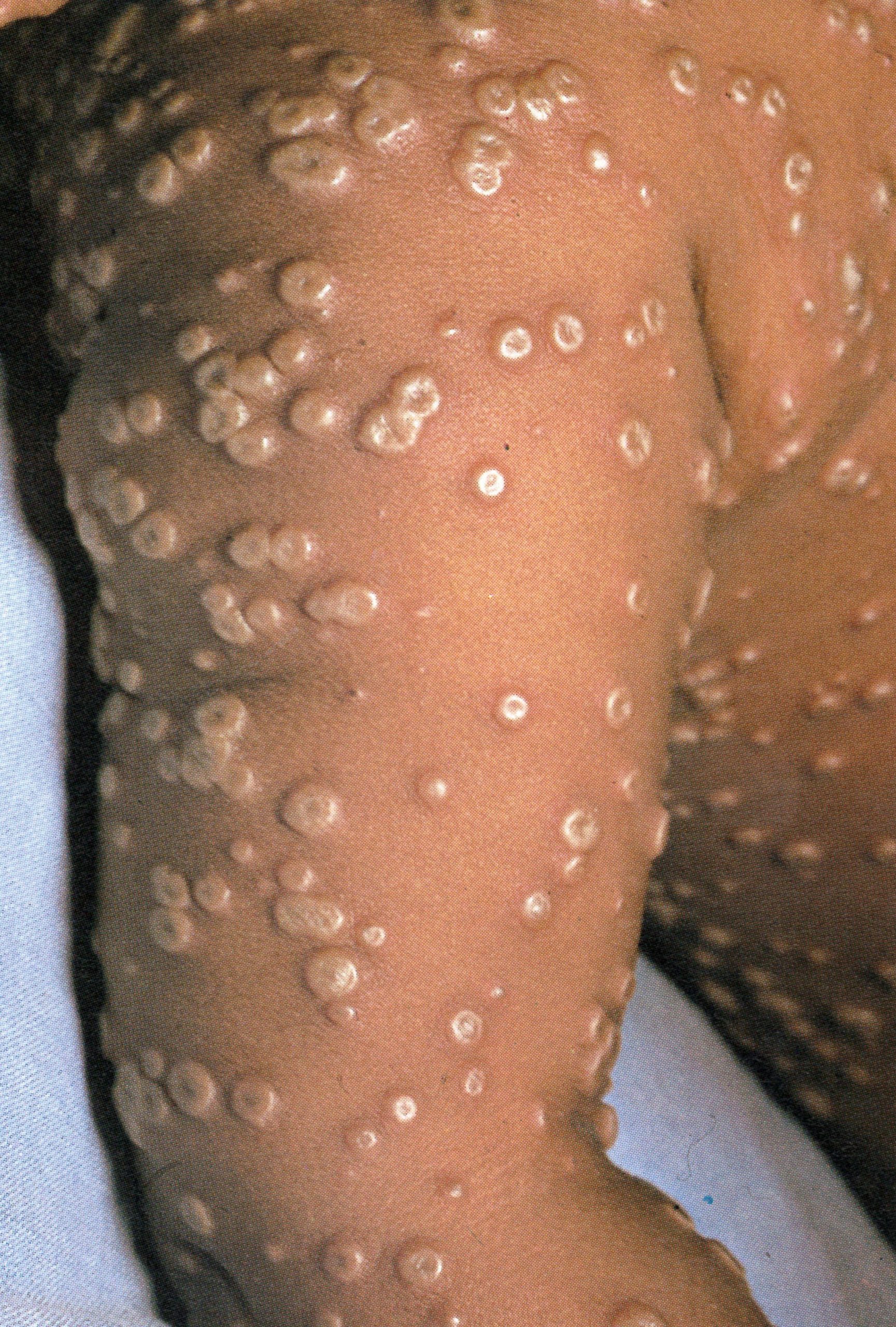 Although a rare disease, human monkeypox ranks first among the diseases that might be confused with smallpox, because differential diagnosis was impossible on clinical grounds alone, although gross lymphadenopathy was found in most cases of monkeypox and not in smallpox (see Chapter 29). In the field, diagnosis depended on the occurrence of a disease indistinguishable from ordinary-type smallpox in the appropriate epidemiological situation: a particular geographical area (western and central Africa), no endemic smallpox, and the appropriate environmental surroundings (a small village in a tropical rain forest). Laboratory confirmation was essential, either by recovery of the virus from lesion material or retrospectively by appropriate serological tests.