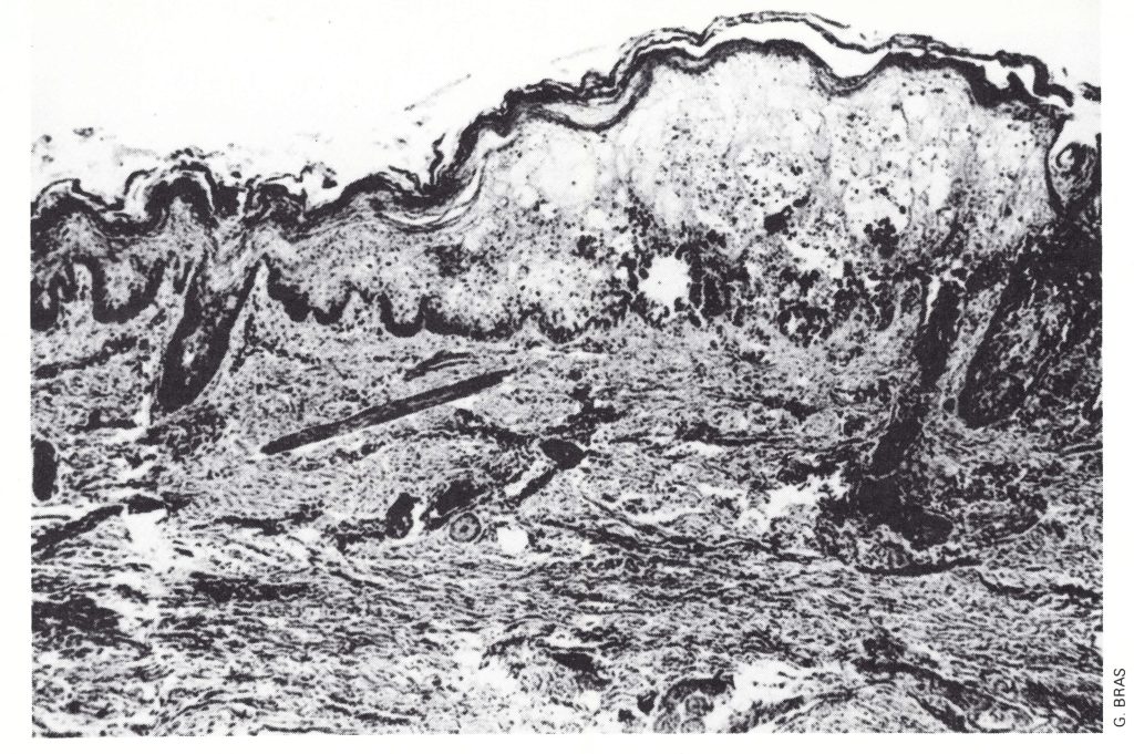 Plate 1.15. Section of a skin lesion on the 6th day of rash. Ballooning degeneration of the cells of the lower part of the epidermis has produced a loculated vesicle which is becoming pustular. The keratohyalin and horny layers form the roof of the vesicle; at the base the dermis is undamaged-there will be no scarring after healing. The central depression associated with the hair follicle on the extreme right would produce loculation of the lesion. (Haematoxylin and eosin, x 50.)