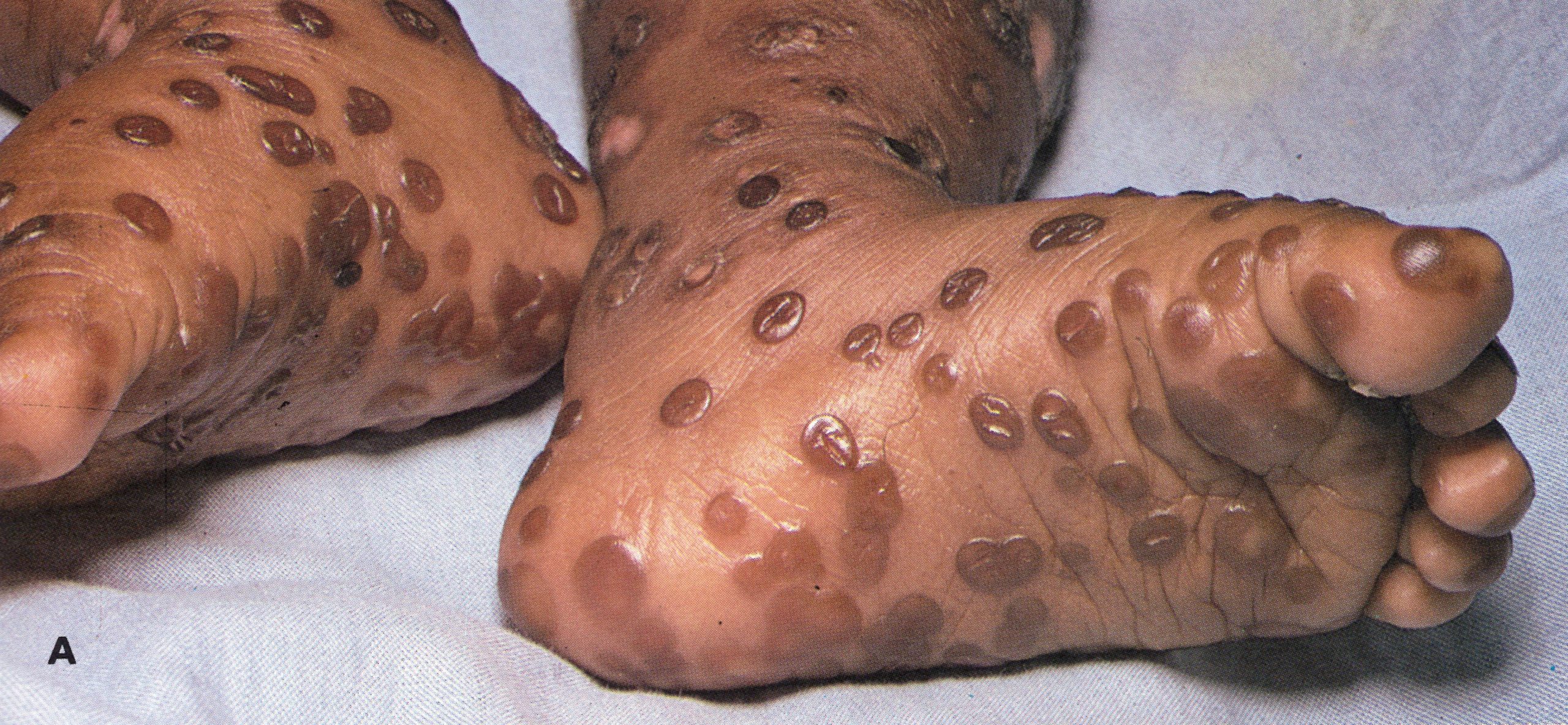 The palms of the hands and the soles of the feet, because of the very thick stratum corneum, were characterized by the persistence of lesions long after these had scabbed elsewhere. On the soles of the feet especially they had a very characteristic appearance (Plate 1.16). The thick cuticle lay over them and they did not protrude from its level surface, through which the disc-like scabs could be clearly seen. These lesions were called “seeds” and were often artificially removed with a needle in attempts to hasten discharge from the hospital, where patients were usually held until the last scab had separated.
