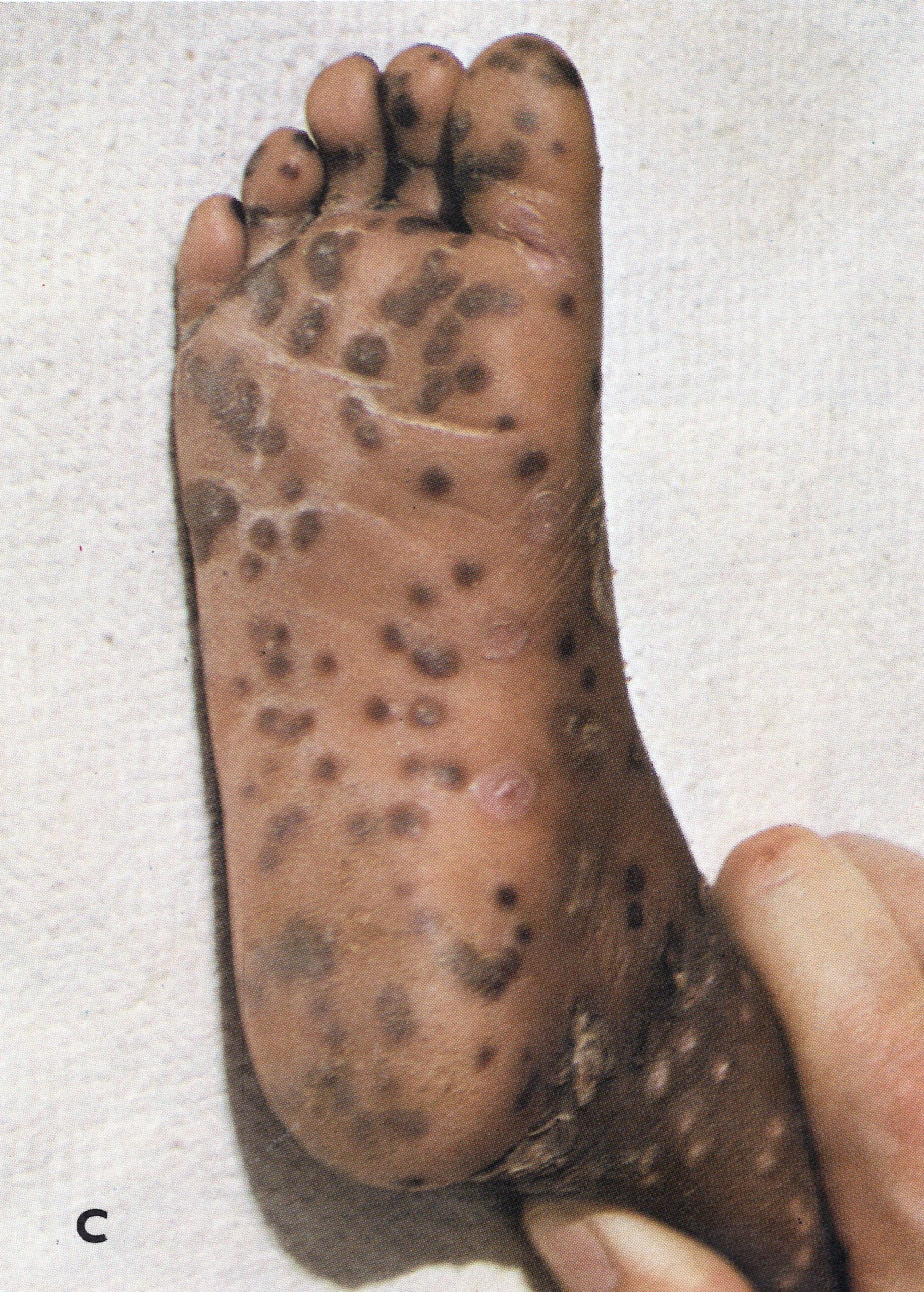 Plate 1.16. Lesions on the sole of the foot on the 14th day of rash.Band C: Palm of the hand and sole of the foot of a 2-year-old Zairean boy on the 21st day of rash. Elsewhere on the body the scabs had separated; on the palms and soles they remained as dark disc-like scabs (“seeds”).