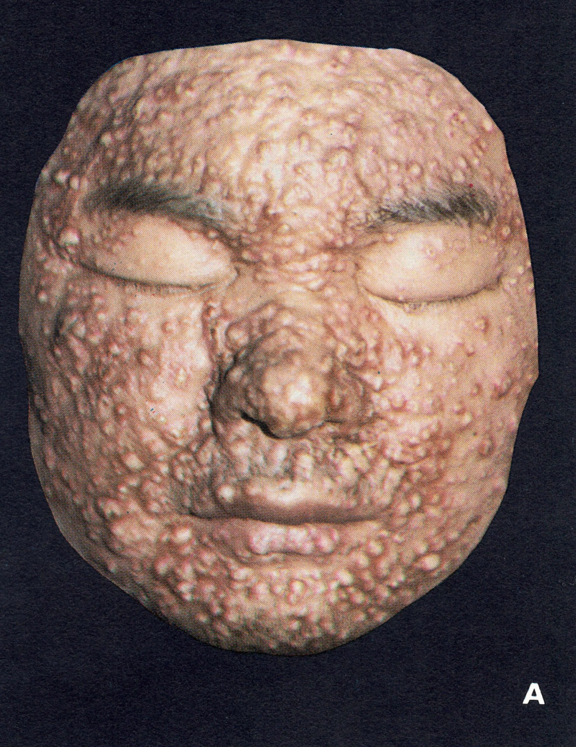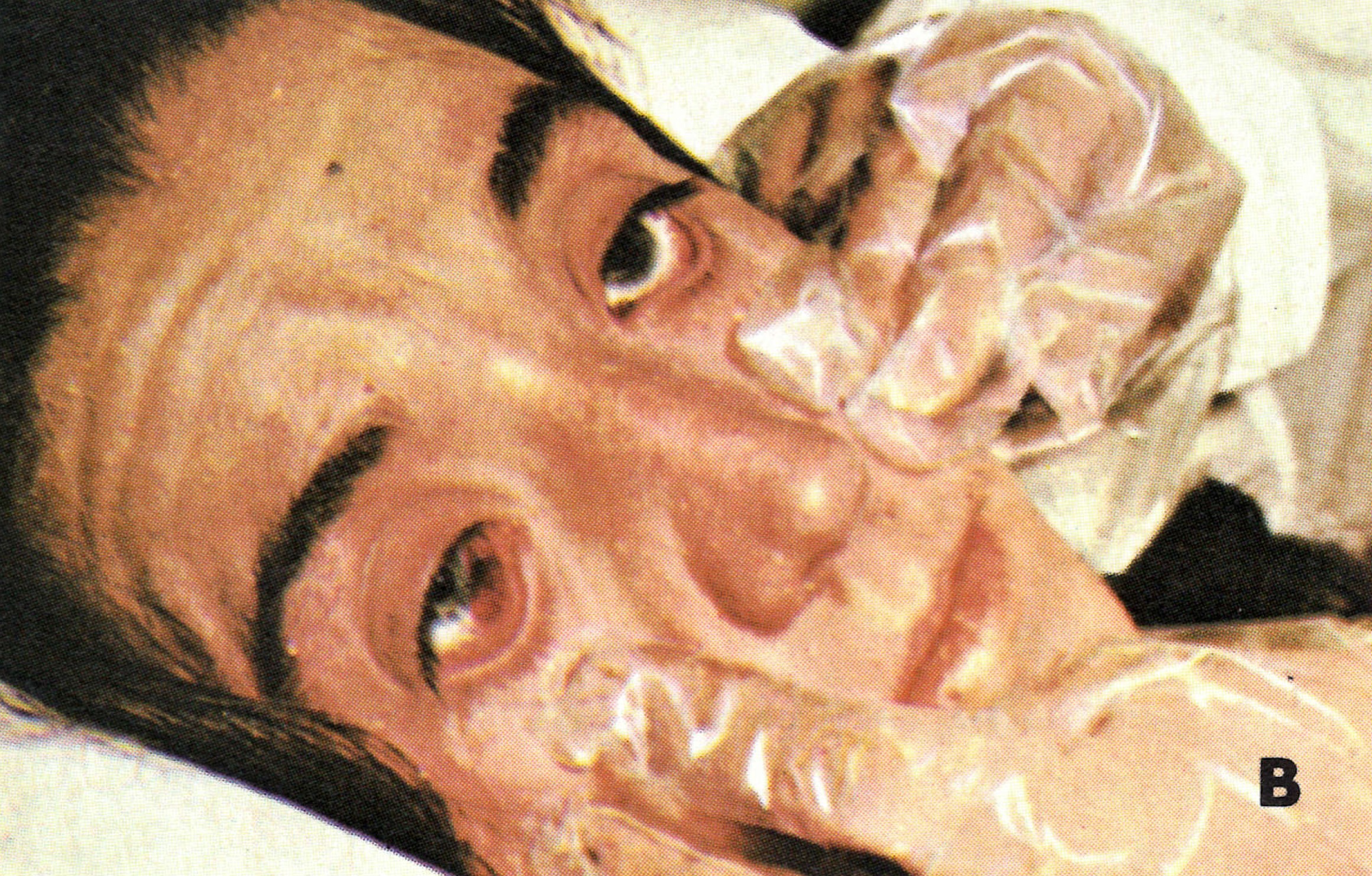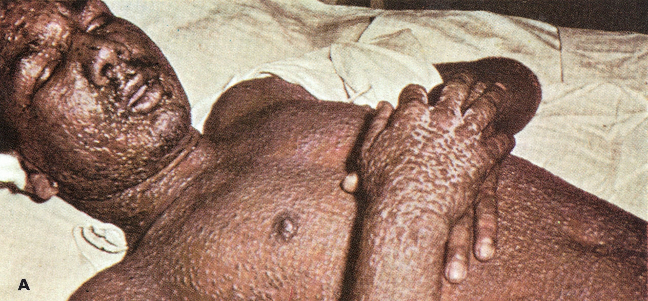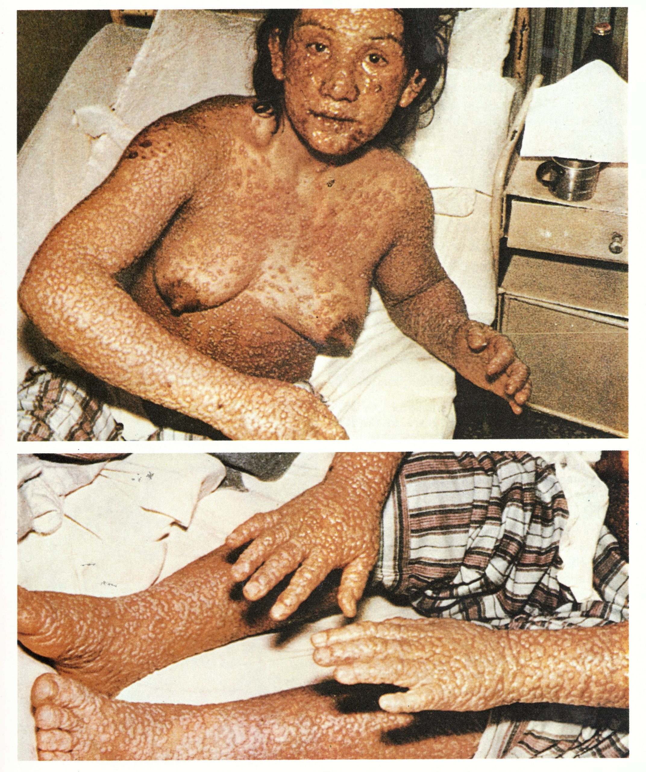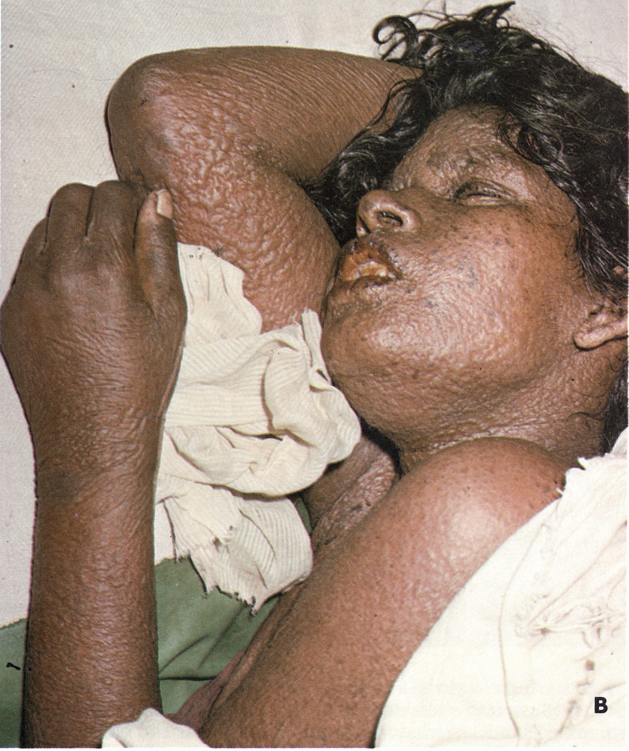 This subtype encompassed cases in which the pustular skin lesions on the extensor surfaces of the extremities as well as those on the face were confluent (Plate 1.18). In such cases the temperature, which had fallen on the 4th or 5th day after the onset, rose again 2 days later and remained elevated until scabbing was complete. Sometimes the toxaemia did not abate, and the temperature did not fall even after scabs had formed over all lesions; when this occurred, the prognosis was poor. In Rao’s series the case-fatality rate of confluent ordinary-type smallpox in unvaccinated subjects was 62%.