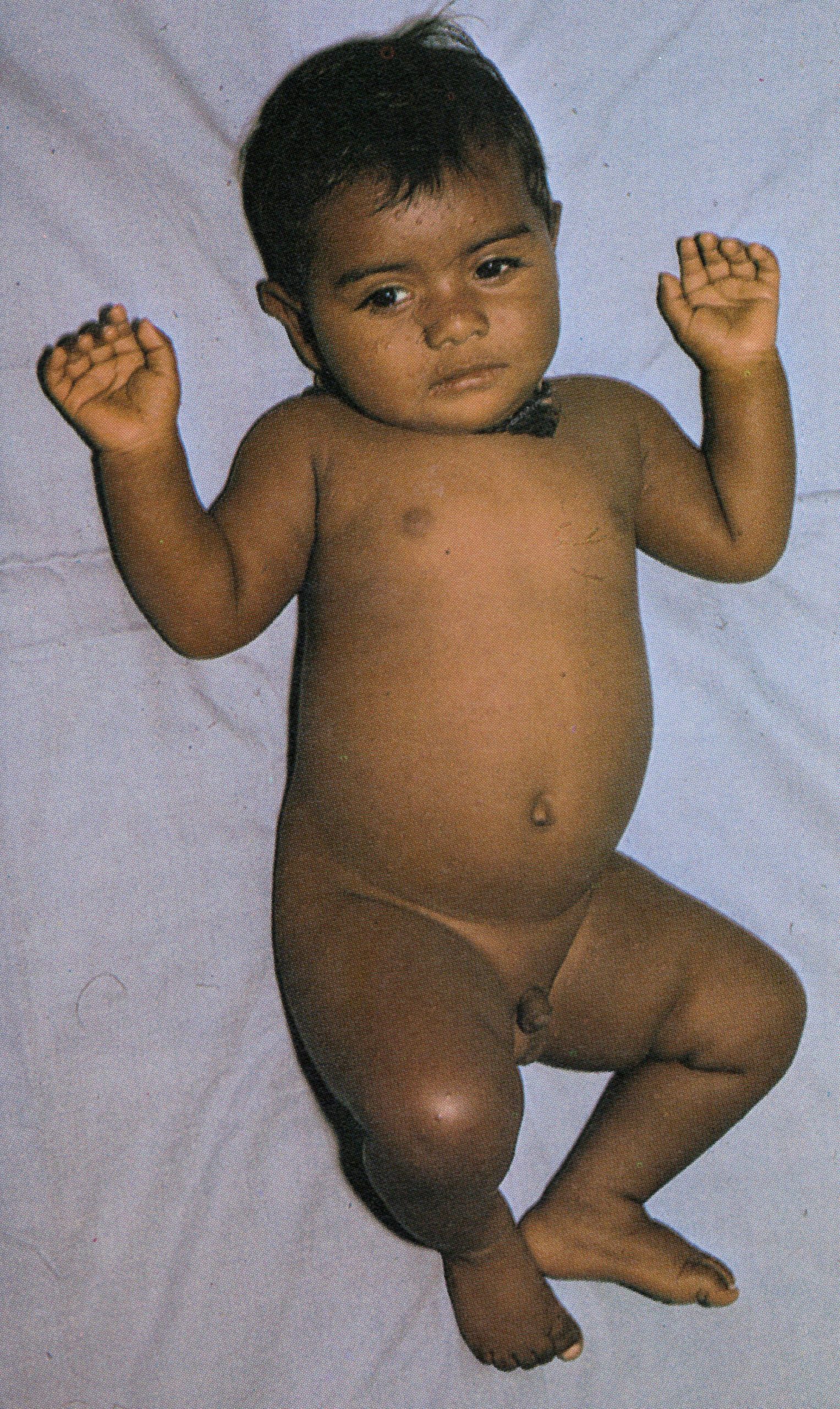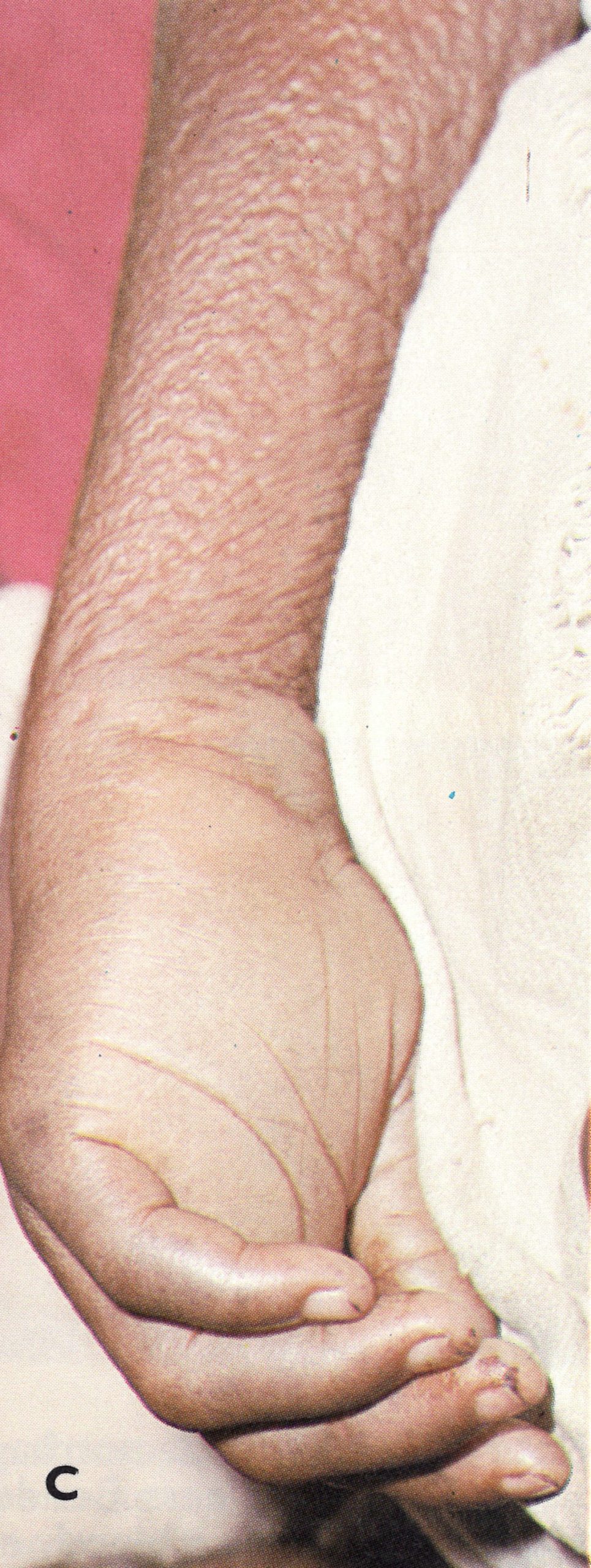 The rash of smallpox had a characteristic centrifugal” distribution pattern. This is apparent in the series of full-body photographs of the Pakistani infant (e.g., Plate 1.11), but is better shown in Plate 1.17. The rash was most dense on the face; more dense on the extremities than on the trunk; and, on the extremities. it was more dense on the distal parts than on the proximal, on the extensor than on the flexor surfaces and on the convexities than on the concavities. The apex of the axilla was relatively free of lesions compared with the folds; this was known as Ricketts’ sign. The palms of the hands and the soles of the feet were involved in a majority of cases (Plate 1.16).