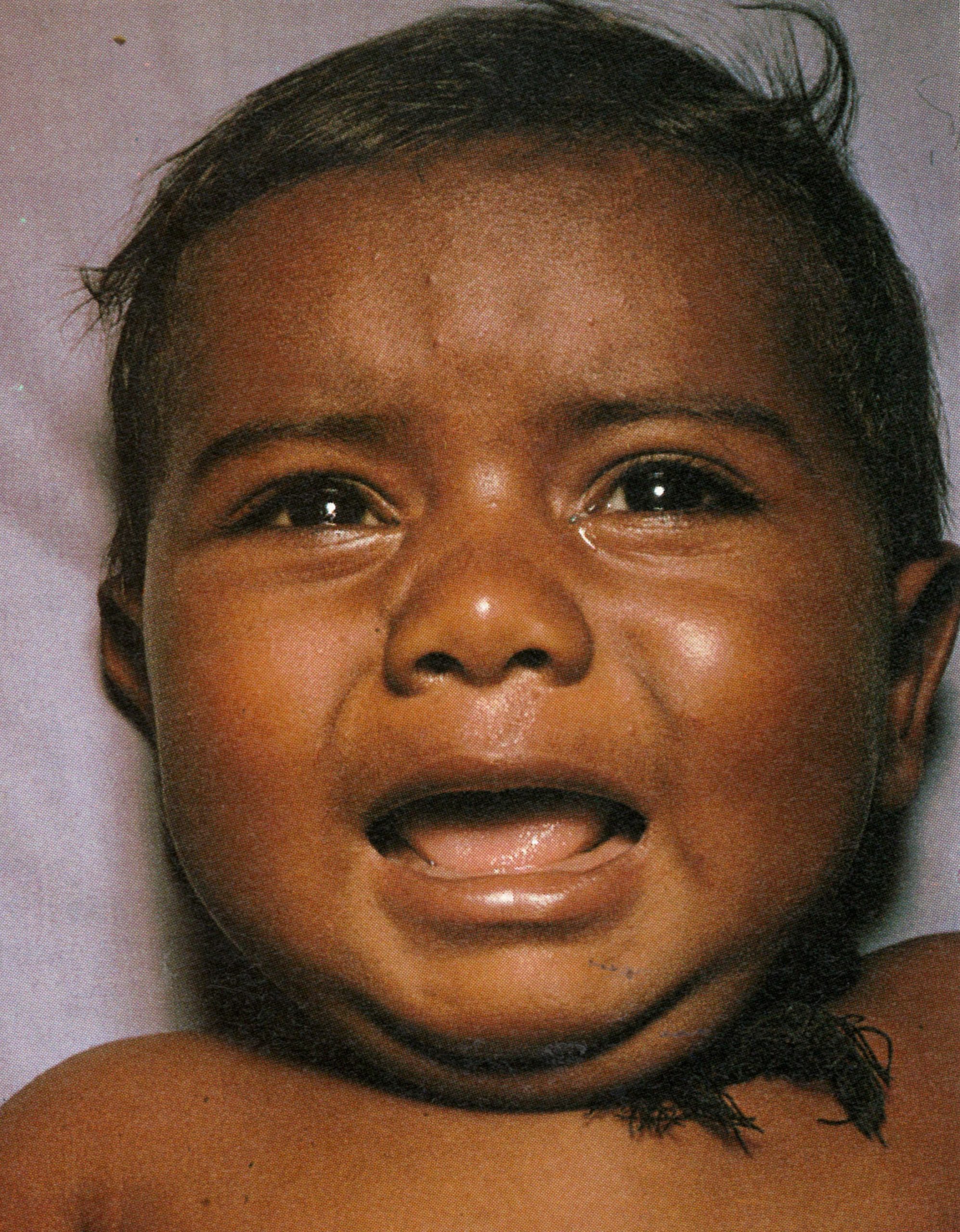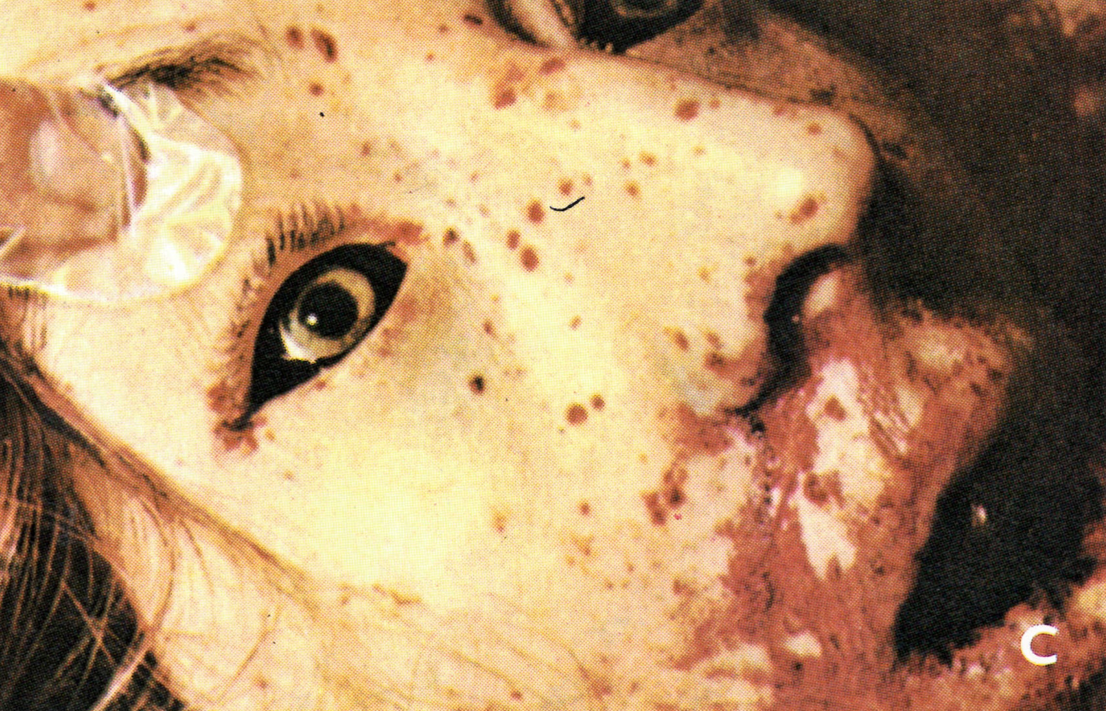 Plate 1.13. Thirteenth day of rash. The lesions are now scabbing, but the eyelids are more swollen than at earlier times. There is no evidence of secondary bacterial infection of the skin lesions.