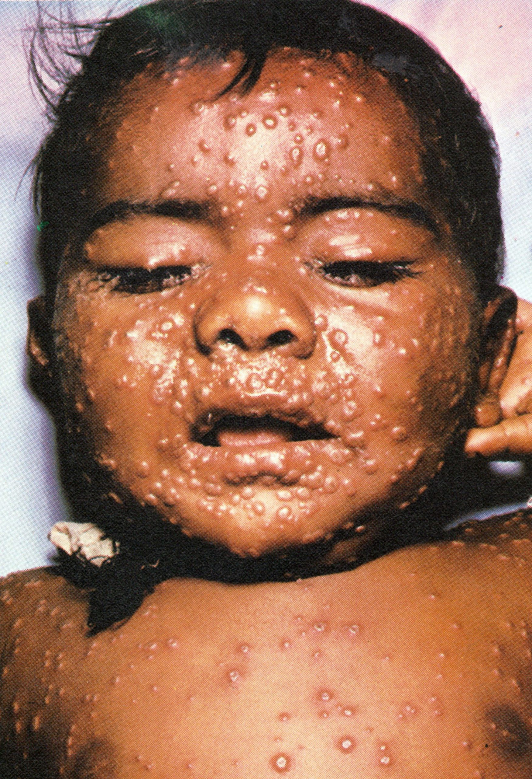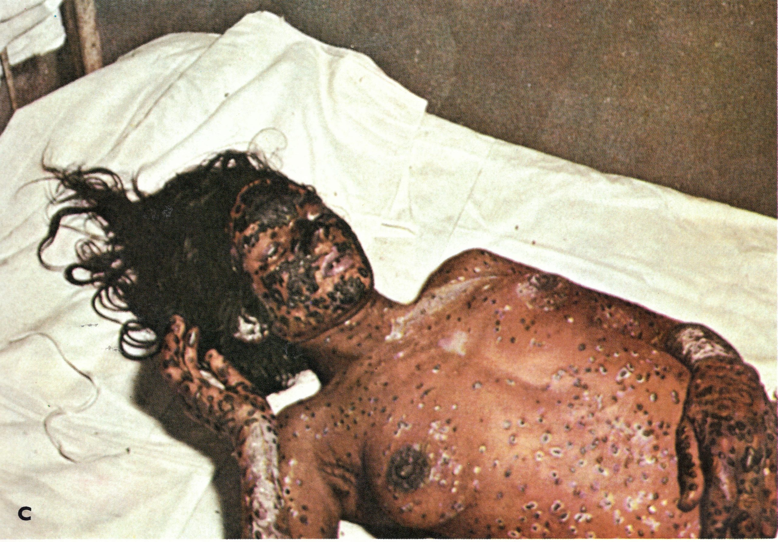 If secondary pyogenic infection of the skin occurred, the fever usually remained elevated. Respiratory complications, which sometimes developed on about the 8th day of the disease, were either viral or bacterial in origin. In fatal cases, death occurred between the 10th and 16th days of the illness. Among survivors, scabs separated by the 22nd-27th days, but “seeds” in the palms and soles remained much longer unless artificially removed.