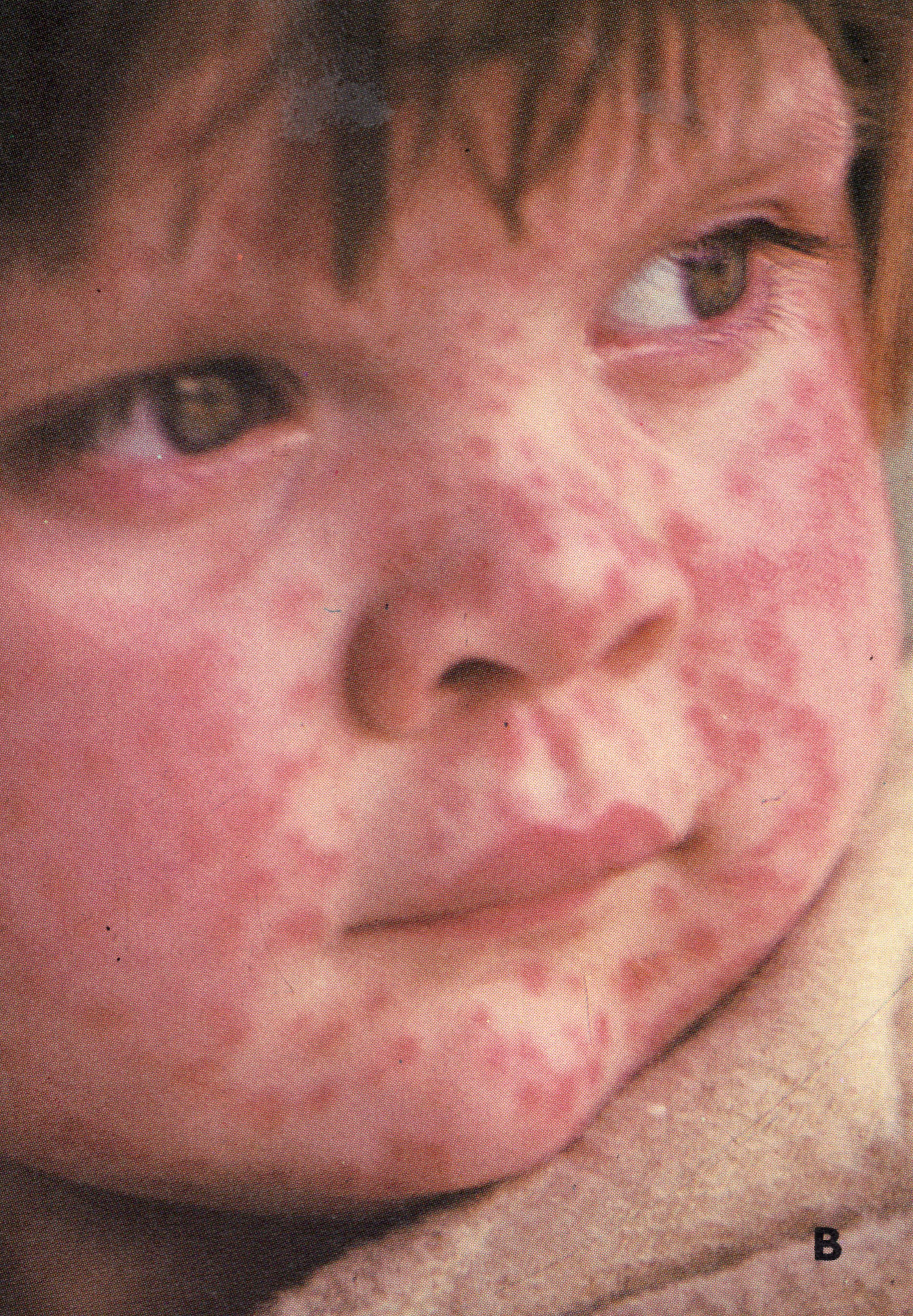 In the first 2 days of the rash, before vesicles developed, the most likely cause of confusion was measles (Plate 1.29A), and this difficulty could persist for several more days in flat-type smallpox, although the severity of this disease was much greater than that of measles. The presence of Koplik’s spots was, of course, diagnostic of measles, and in any case the difficulty disappeared as the rash evolved. Historically, measles did not present a problem in countries with endemic smallpox, but in non-endemic countries an early case of smallpox was sometimes diagnosed as measles, with possibly serious consequences in terms of secondary cases. On the other hand, in countries in which smallpox was endemic, physicians were often prone to diagnose all outbreaks of rash associated with deaths as smallpox and to report them as such to the health authorities. Some of these outbreaks later proved to be due to measles.
