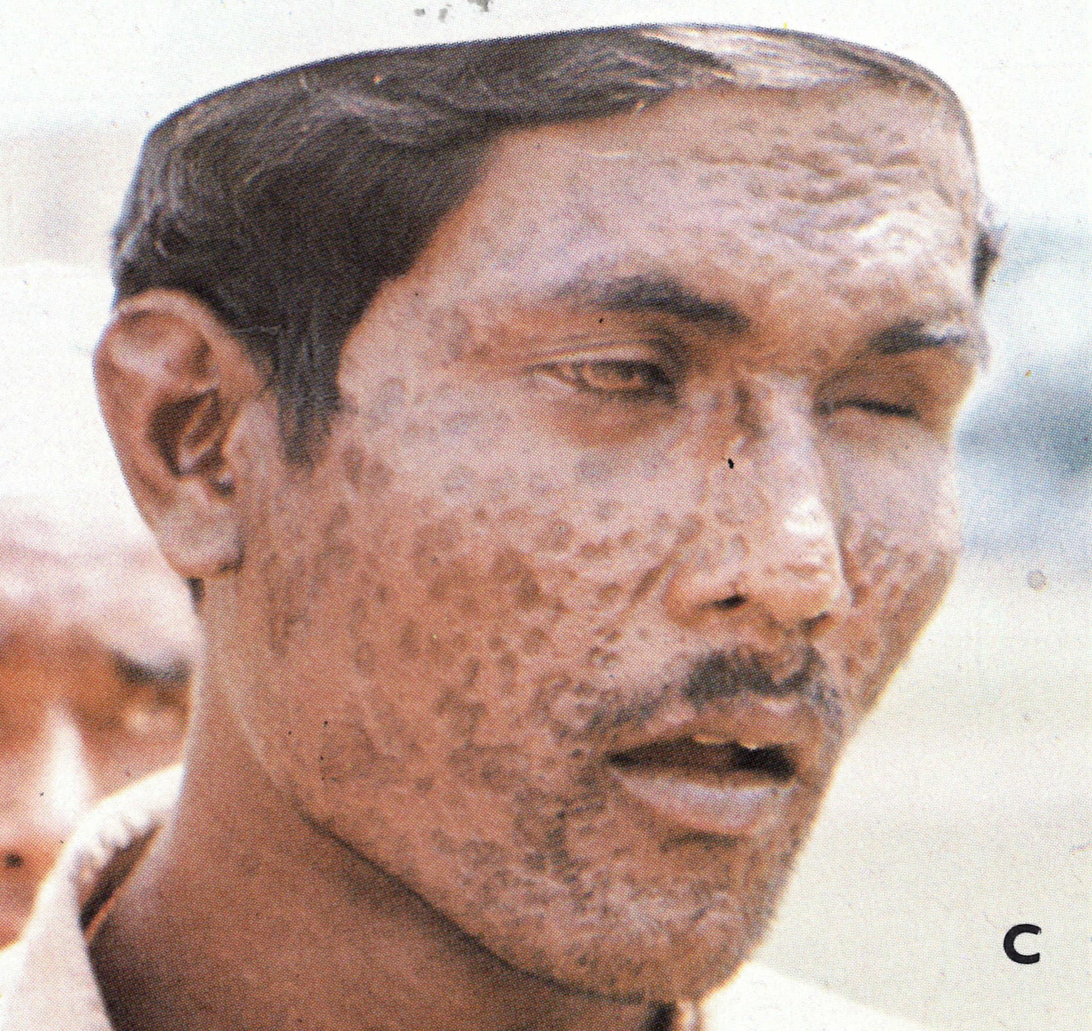 Plate 1.19. Modified-type smallpox. A: Vaccinated Japanese ma11 aged ’42 years, on the 10th day of the illness. Note the varying size of the lesions and their rapid evolution. B: Vaccinated Japanese woman aged 19 years. Very mild case. C: Adult female. Delhi, India. Note lack of toxaemia and diversity in size of lesions. (A and B from Uchida, 1955; C from Herrlich et al., 1967.)